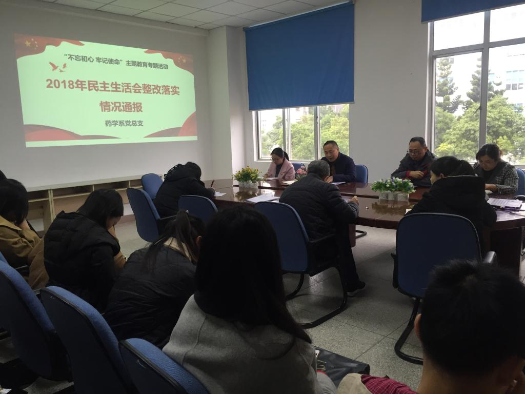 2019年12月5日,藥學(xué)系黨總支在系部會議室召開2018年民主生活會整改落實情況反饋會,藥學(xué)系全體教職工到場參會,會議由藥學(xué)系黨總支鄭力宏書記主持。