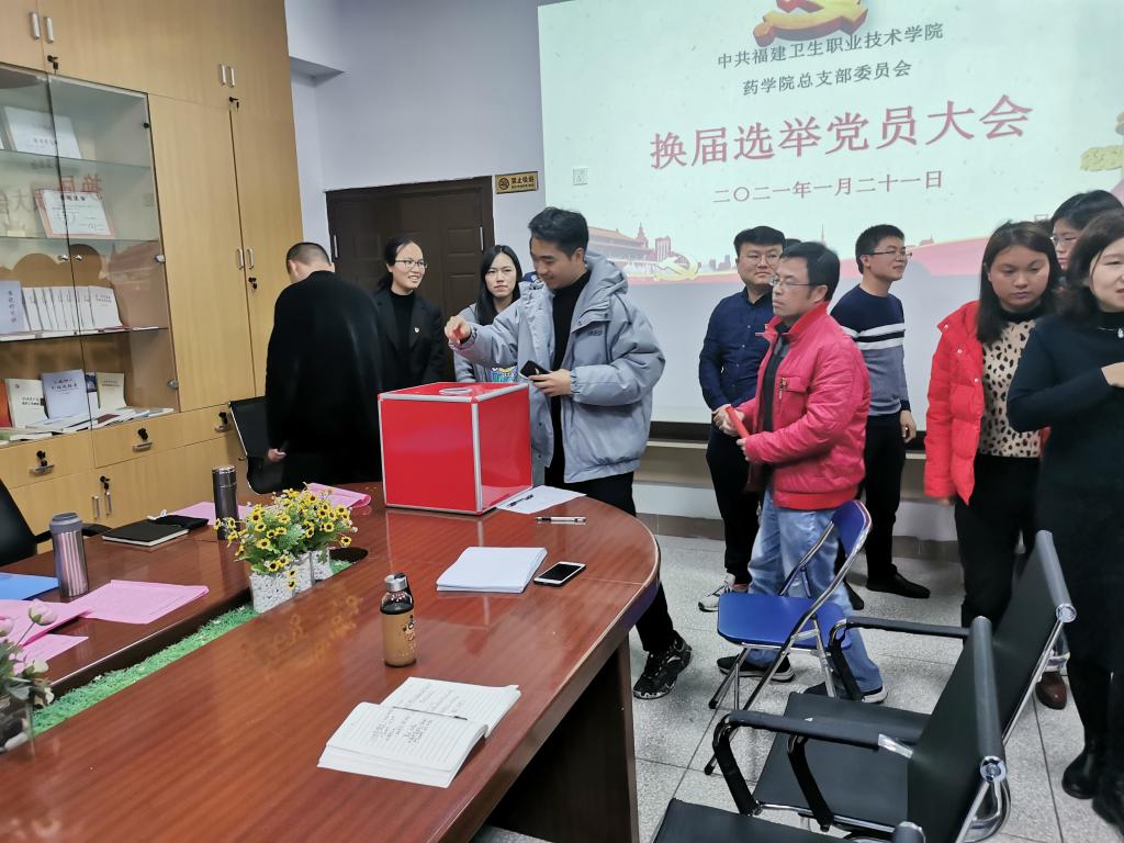 大會嚴格按照《中國共產黨章程》、《中國共產黨基層組織選舉工作暫行條例》和院黨委的有關規定,先后表決通過了藥學院黨總支部工作報告的決議(草案)、《中共福建衛生職業技術學院藥學院黨總支部換屆選舉辦法(草案)》、監票人、計票人名單,采取無記名投票方式選舉產生了新一屆藥學院黨總支委員。換屆選舉黨員大會圓滿完成各項議程,在雄壯的《國際歌》中閉幕。