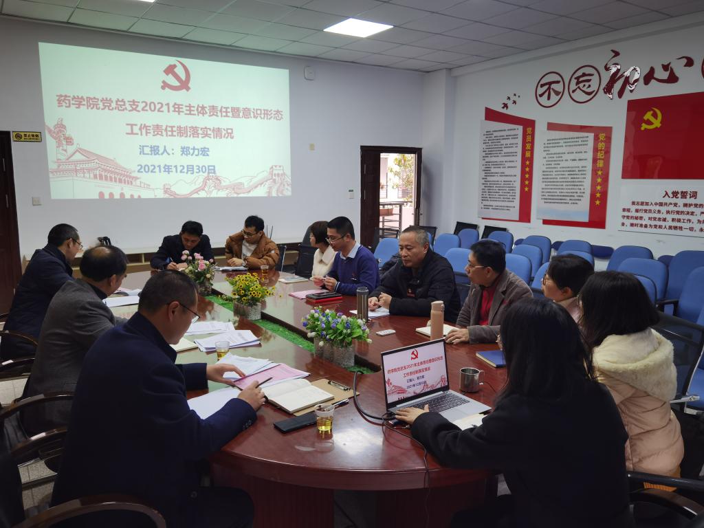 2021年12月30日,藥學院黨總支在院部會議室召開2021年全面從嚴治黨主體責任暨意識形態工作責任制落實情況督查會議,校紀委書記游鋒、紀委辦公室副主任(主持工作)傅衍達、校黨政辦公室科員高繼璐等一行到場巡查,校工會專職副主席(藥學院原黨總支書記)鄭力宏、藥學院黨政領導班子成員、總支支委、各支部書記參加本次會議,會議由藥學院黨總支書記林穎峰主持。