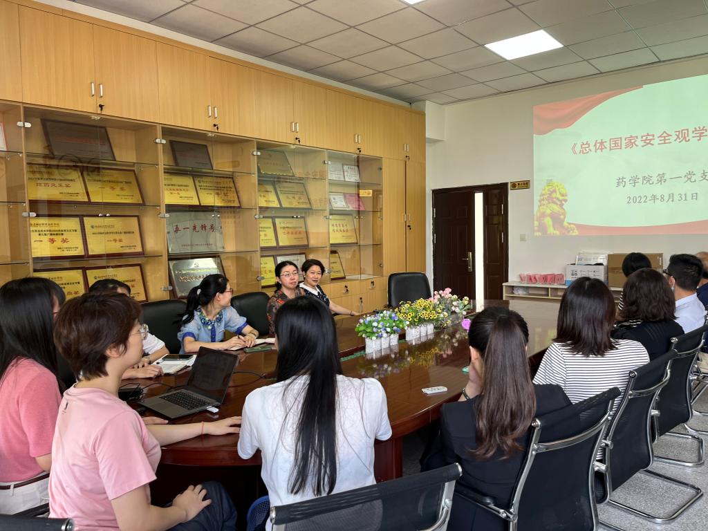 為深入學習貫徹習近平總書記總體國家安全觀,2022年8月31日,藥學院第一黨支部在藥學院會議室開展主題黨日活動,全體黨員到場學習,活動由支部書記羅蘭主持。