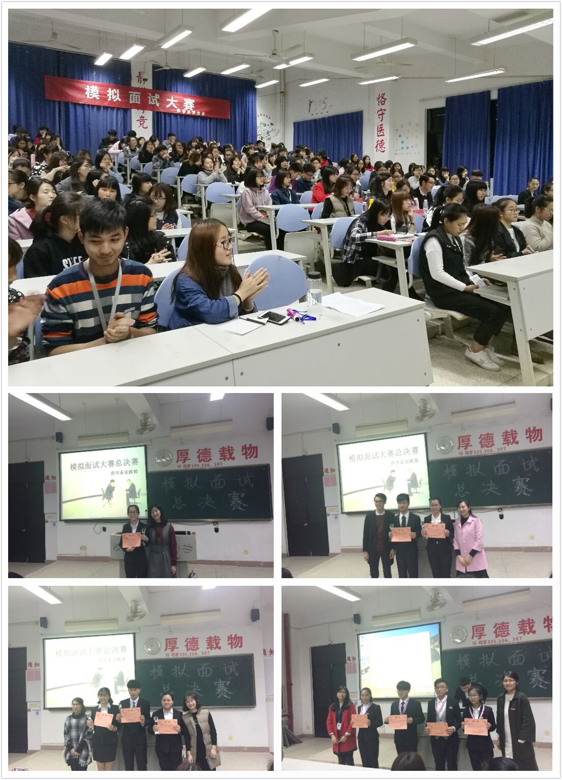 本次決賽共有十名選手參加。現(xiàn)場(chǎng)增設(shè)觀眾席,為新老生提供觀摩和學(xué)習(xí)的機(jī)會(huì)。大賽嚴(yán)格按照企業(yè)招聘面試的形式進(jìn)行,采取選手自我展示以及一對(duì)多的問答方式全真地模擬面試現(xiàn)場(chǎng)。比賽現(xiàn)場(chǎng)精彩紛呈,在自我展示環(huán)節(jié),選手們各施其能,巧妙結(jié)合PPT向評(píng)委們展現(xiàn)一個(gè)大學(xué)生的才華橫溢;在問答環(huán)節(jié),評(píng)委們?cè)噲D從平常的學(xué)習(xí)生活中去發(fā)掘面試者的能力,看似普通的“家常閑聊”,卻處處暗藏玄機(jī)。最后,鄭彬焮女士對(duì)本次比賽做了精辟的點(diǎn)評(píng)。既贊賞了選手們?cè)诒荣愔械木时憩F(xiàn),也一針見血地指出了選手們?cè)谀M面試中出現(xiàn)的問題,并針對(duì)這些問題,提出了相應(yīng)的建設(shè)性意見。最后,15藥學(xué)306陳琳精同學(xué)憑借其對(duì)時(shí)事政策的刨析、超強(qiáng)的實(shí)力脫穎而出,摘得本次模擬面試大賽的桂冠;15藥學(xué)306的林健輝同學(xué)以及15中藥301江思思同學(xué)也以穩(wěn)定的應(yīng)變能力榮獲二等獎(jiǎng); 15中藥302林瑤霖、15藥學(xué)303林夏蓮、15藥學(xué)310陳錦賢獲三等獎(jiǎng),其余四名同學(xué)獲得優(yōu)秀獎(jiǎng)。