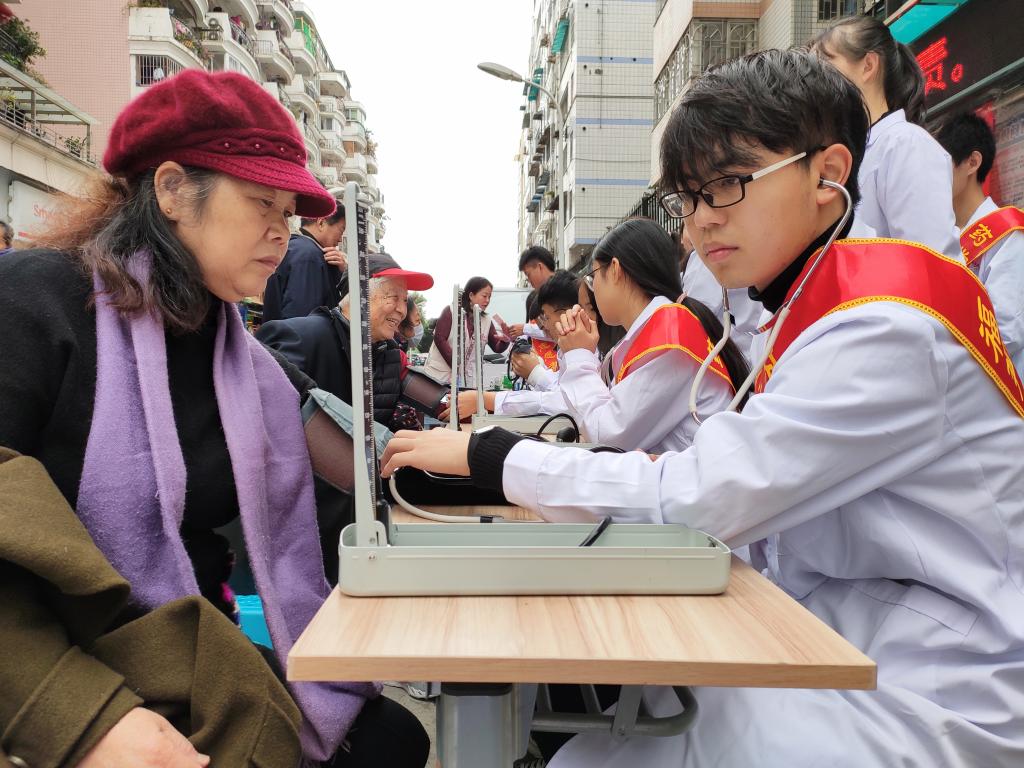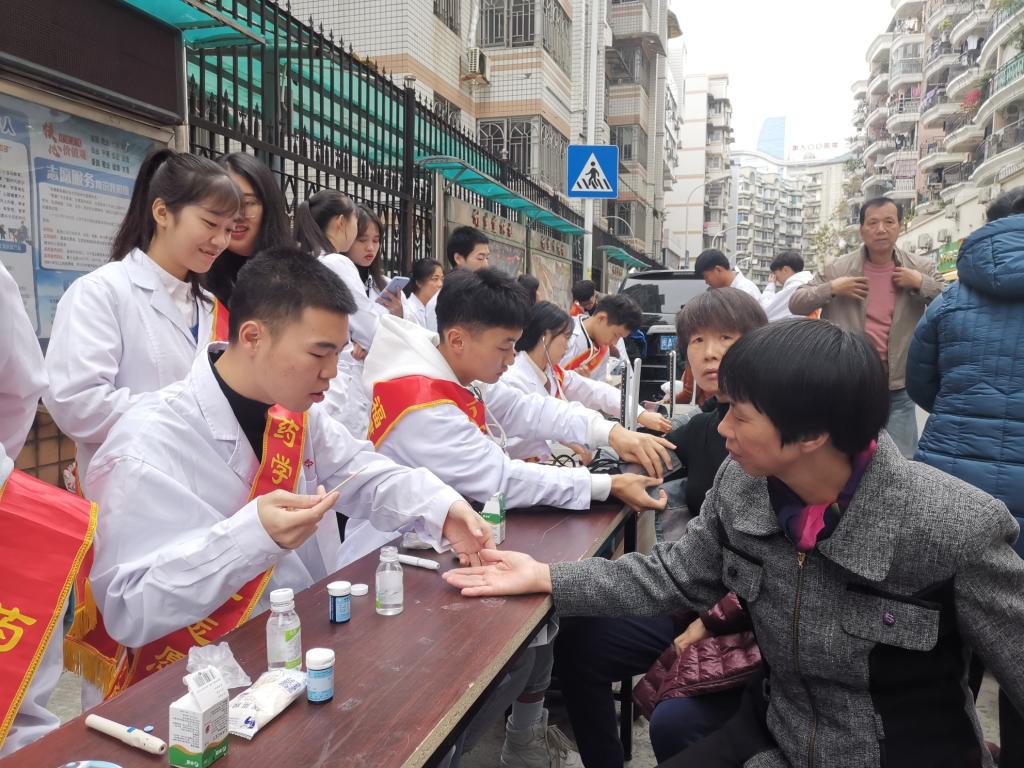 當天上午,志愿者們早早地到達社區(qū)進行準備工作,各司其職,各盡其責(zé)?;顒娱_始不久,排隊群眾就絡(luò)繹不絕。同學(xué)們認真、熱情地為每一位居民們提供量血壓、測血糖、推拿拔罐、健康知識宣講等義診服務(wù),并對居民咨詢的問題一一給予解答。同時,還提醒前來就診的老年人要定期進行體檢,鼓勵他們要樹立積極樂觀的生活態(tài)度,對部分存在亞健康的年輕人建議要規(guī)律作息時間,合理搭配飲食,養(yǎng)成健康的生活習(xí)慣。