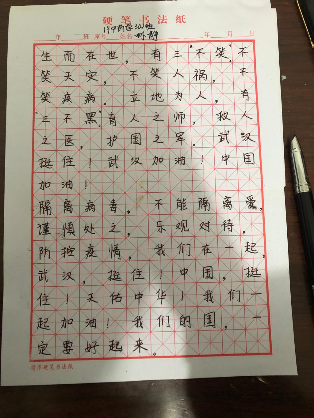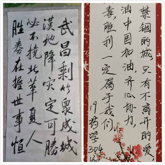新型冠狀病毒肺炎疫情來勢洶洶,牽動著閩衛院學子的心。藥學系學子以書法作品和書信的形式, 積極投身抗擊疫情的歷史洪流,助力抗“疫”。此次活動共收集書法、書信作品七十幾件。筆墨行間對奮戰在疫情前線白衣天使的崇敬之情,對戰勝疫情的信心和決心躍然紙上。同學們表示將盡自己的綿薄之力,傳播凝心聚力正能量,助力打贏疫情防控阻擊戰。