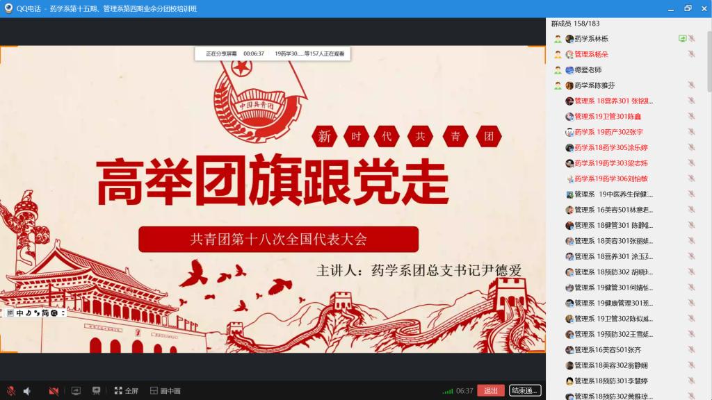 2020年3月5日,為響應停課不停學的號召,藥學系團總支書記尹德愛老師利用QQ線上直播的方式為藥學系第十五期、管理系第四期業余分團校的學員們講授了主題為“高舉團旗跟黨走”的開班第一課。