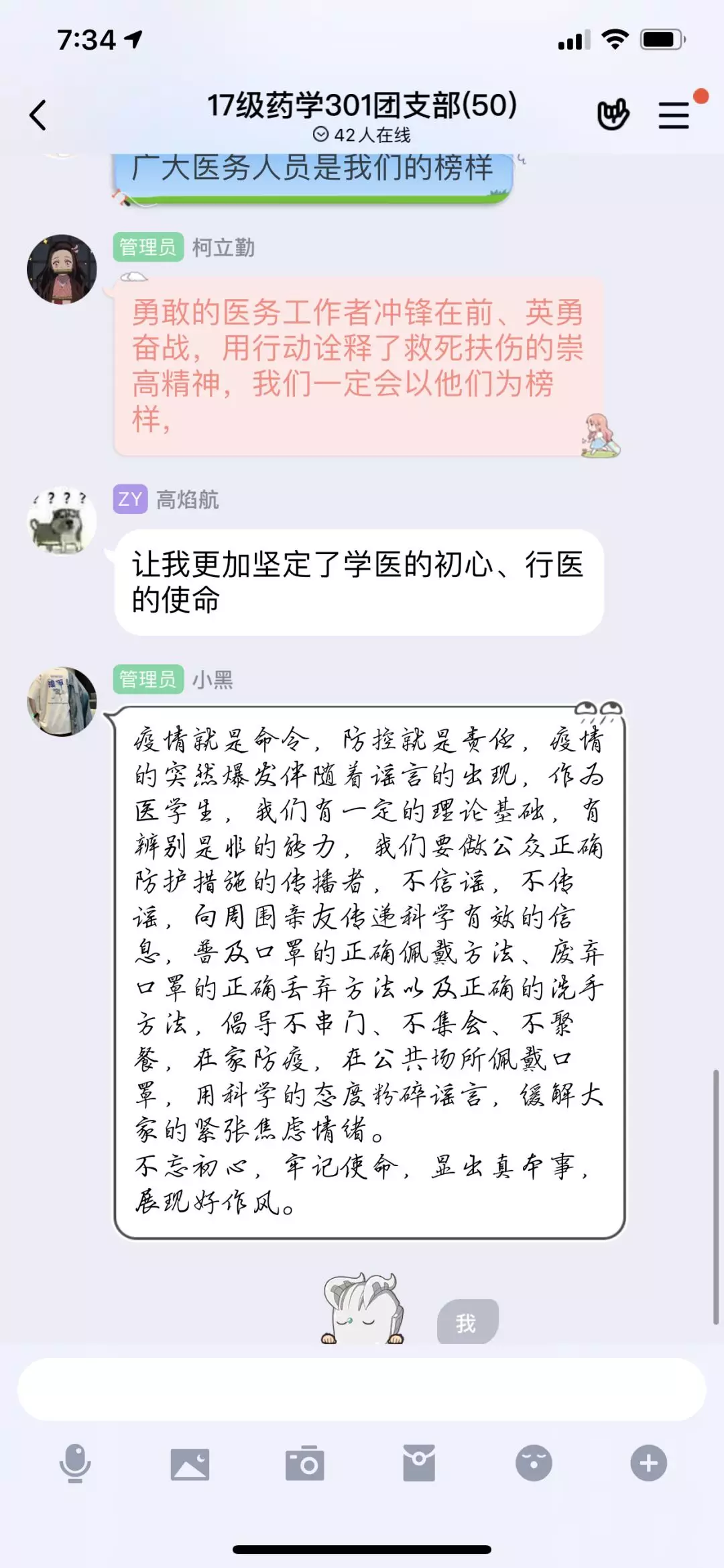 在這個特殊的時期,醫務工作者發揮著極其重要的作用,沖鋒前線的拼搏信念和日夜堅守的晶瑩汗水,不斷鑄成白衣天使救死扶傷的崇高精神。習近平主席的這封信無疑是對醫務工作者的肯定和鼓勵,疫情防控期間我系團學干部就這封信展開了交流學習。系團總支也在第一時間組織各班級團支部通過線上學習貫徹習近平總書記重要回信精神,并分享學習心得。