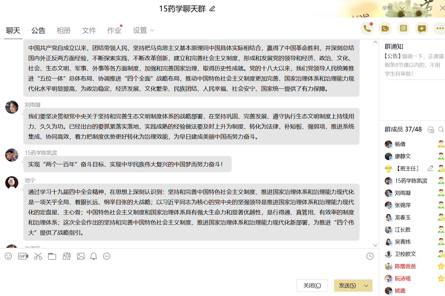 3月3日-5日,藥學系輔導員組織全體學生通過線上學習形式,認真學習《中國共產黨第十九屆中央委員會第四次全體會議公報》,觀看央視新聞視頻和其他媒體對黨的十九屆四中全會內容的報道,并進行線上討論、交流學習心得。