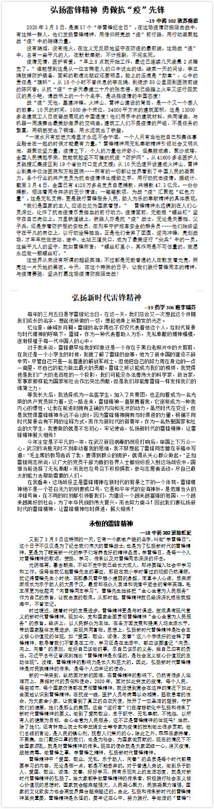 為進一步弘揚新時代雷鋒精神,加強學校精神文明建設,近日,藥學系舉辦了以“弘揚新時代雷鋒精神”為主題的征文比賽。
