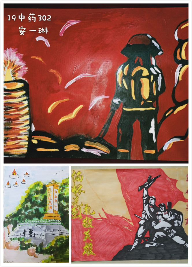 本次活動得到了我系學子的熱切關注和積極響應,同學們紛紛利用網絡、書籍等收集資料,充分發揮想象力與創造力,把對英雄們的敬意融入作品中,運用畫筆向英烈與抗疫英雄致敬,呈現出了許多主題鮮明、設計新穎、內容豐富的作品。經評選,18中藥301班胡曉茹榮獲一等獎;18藥經管302班曾小天、19藥學307班黃劍花榮獲二等獎;18藥經管302班熊慶玲、18藥學301班陳焙焙、18中藥301班楊美娟榮獲三等獎;18中藥301班莊晶晶 、19藥經管302班林筱芮、19藥學302班王思涵、19中藥學302班安一琳榮獲優秀獎。