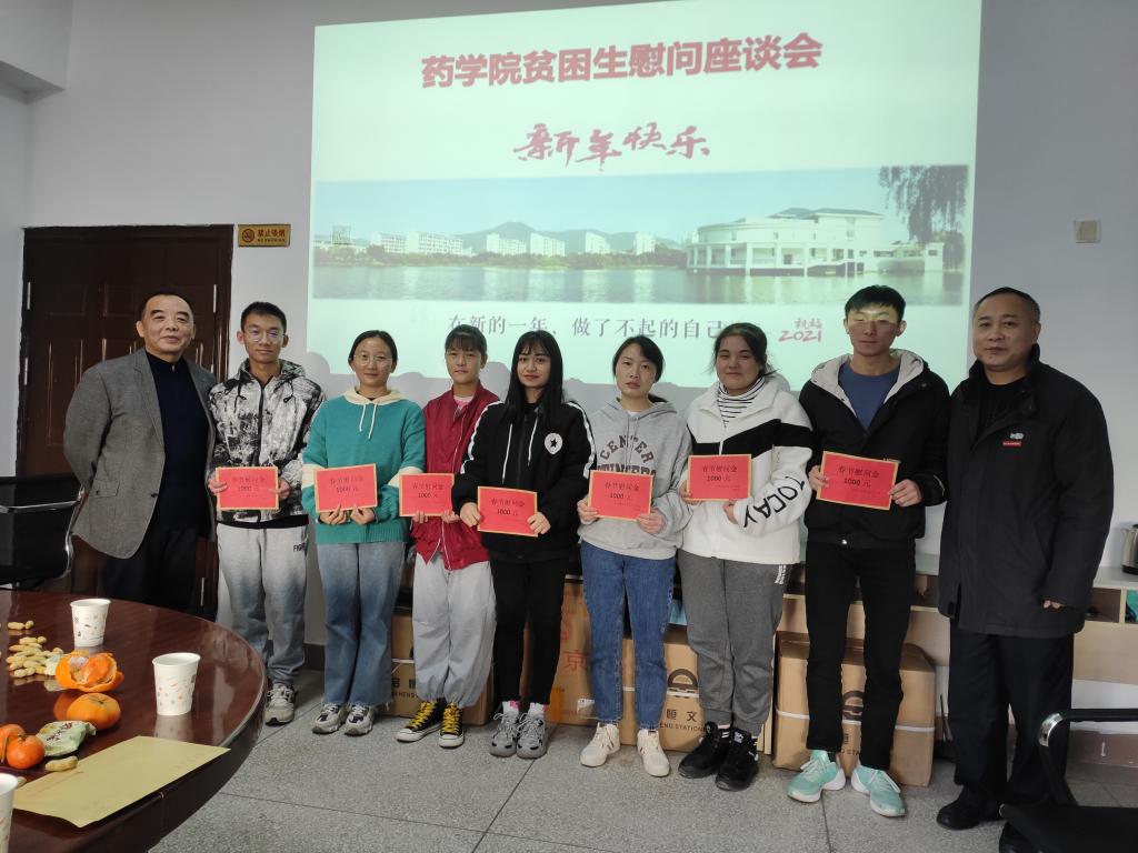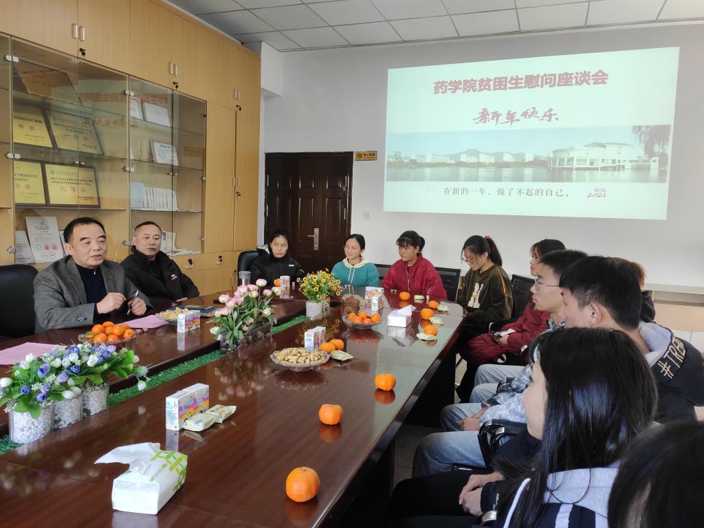 2021年1月1日,藥學院在207會議室召開省外貧困學生春節慰問座談會,學校紀委游鋒書記、藥學院黨總支鄭力宏書記、賴文金副書記以及省外貧困生代表共迎新年、共話未來。