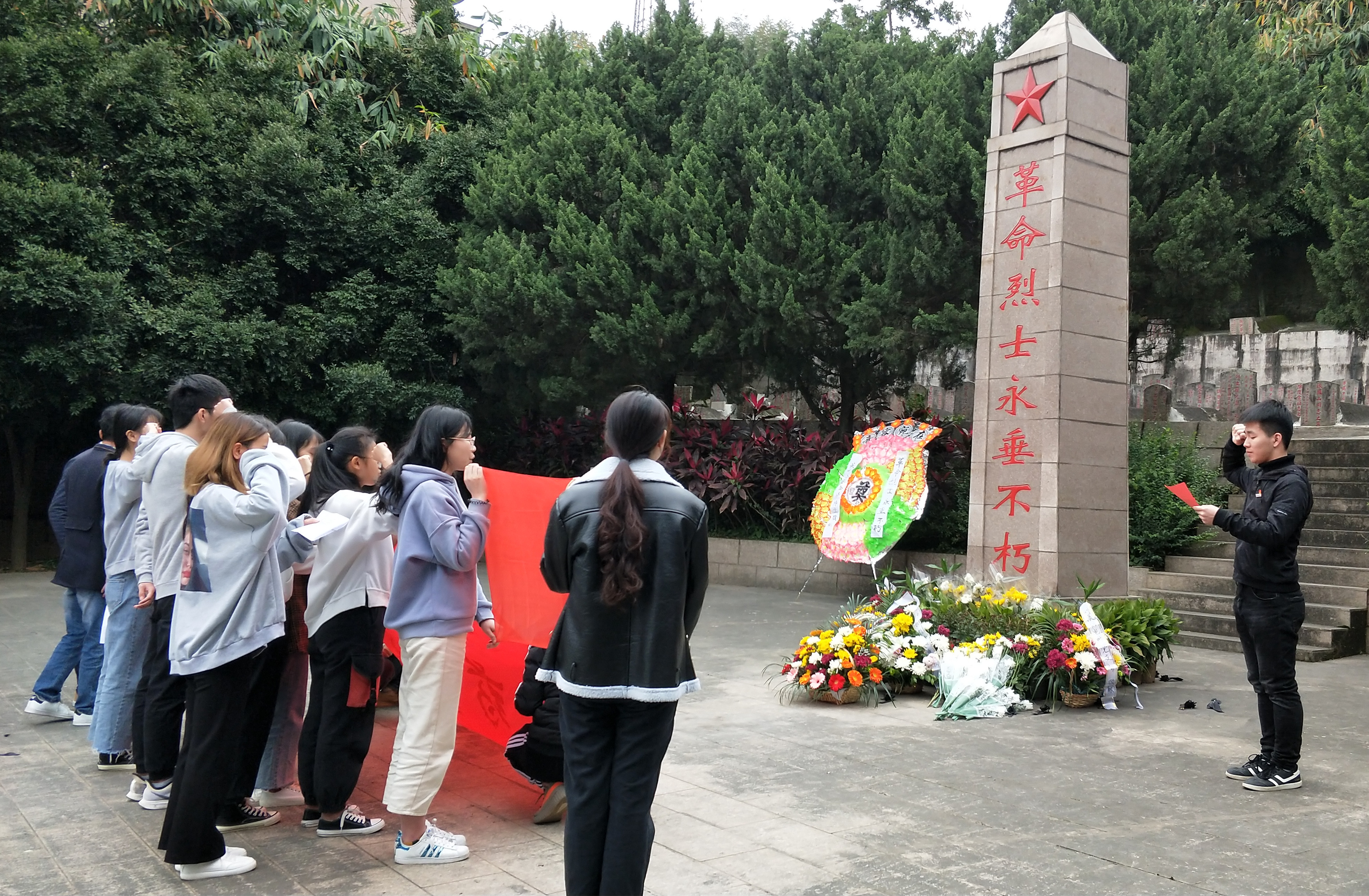 師生們步行來到烈士陵園,在雄偉的烈士紀念碑下,全體師生充滿了對烈士的無比敬仰。在老師組織下,同學們開始認真清掃陵園,清掃完成后在烈士墓前依次排開肅立默哀三分鐘,向為革命獻身的烈士們致敬,藥學系團總支副書記鄭衛敏代表師生向烈士紀念碑敬獻鮮花。隨后,由領誓人帶領同學們在烈士紀念碑下重溫入團宣誓,并莊嚴承諾將努力學習,繼承和發揚革命先烈的遺志,為祖國的建設和發展奉獻自己的青春和熱血。最后,全體師生集體奏唱國歌,以表達自己對英烈的緬懷、敬仰和感恩之情。