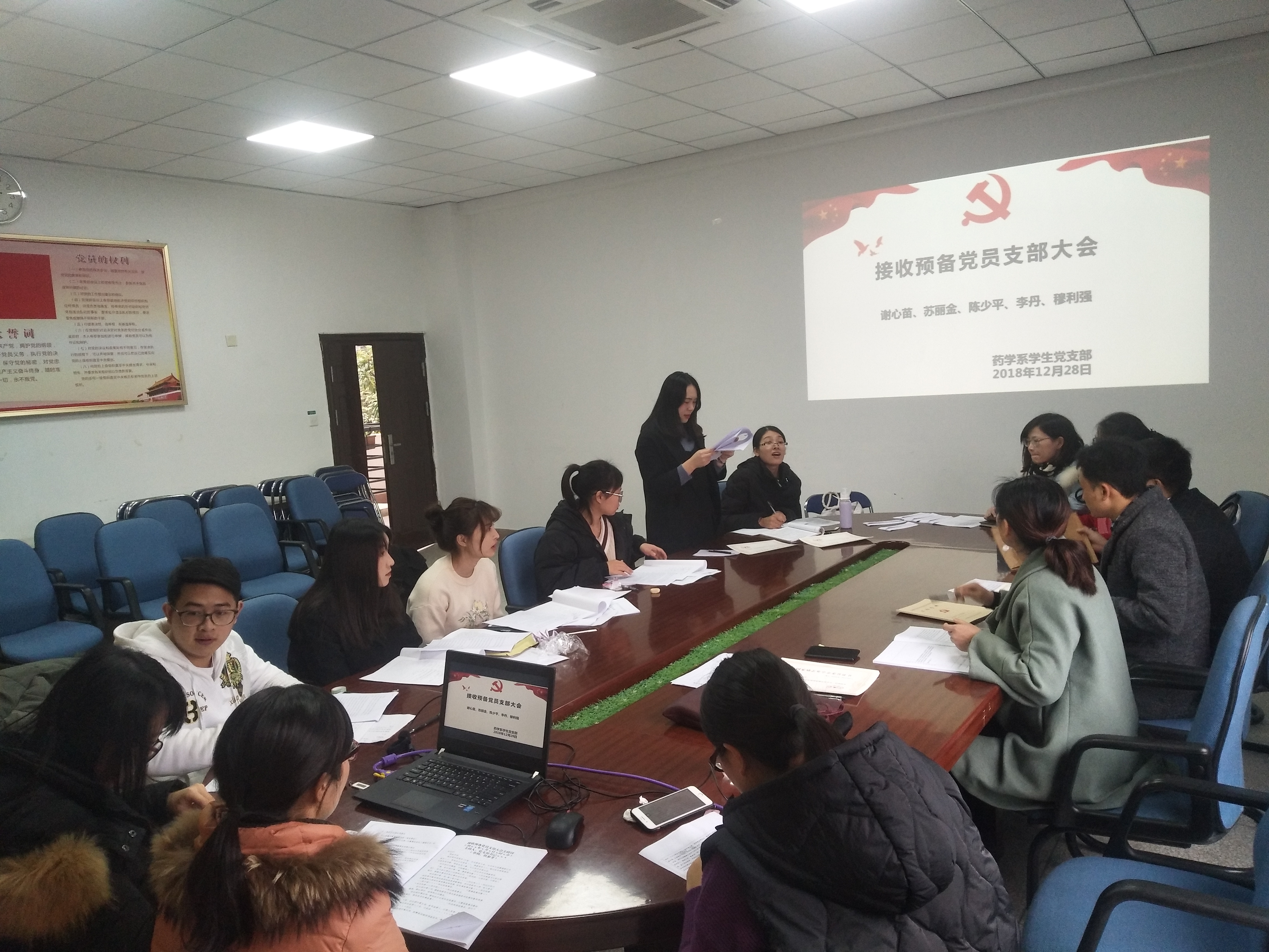2018年12月27日,藥學系學生黨支部在系207會議室召開黨員發展大會,出席人員有學生黨支部10位黨員老師、1名學生預備黨員和5名擬發展對象,會議由學生黨支部書記蘇素嬌同志主持。