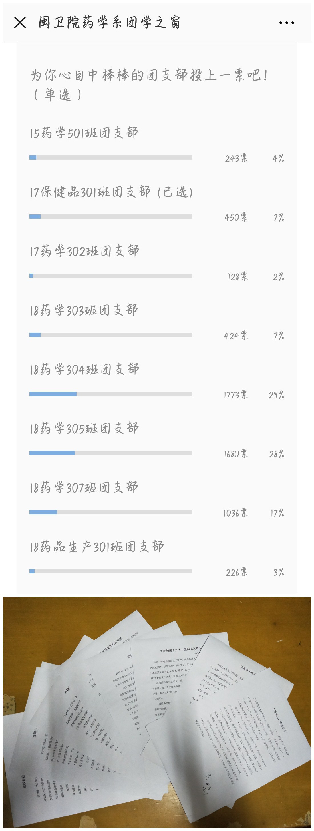 為了更好地宣傳此次團日活動,本次活動通過各班團支部提交的視頻、報道稿質量共評選出了八個優秀團支部。并在此基礎上,依托微信公眾號平臺,在平臺上發起投票,各團支部積極參與其中,為期兩天的網絡投票,票數達5960票,閱讀點擊量達7402次。最終,18藥學304團支部榮獲一等獎和最佳人氣團支部稱號;二等獎由18藥學307團支部和18藥學303團支部獲得;另有五個團支部分獲三等獎,它們分別是:17保健品301團支部、17藥學302團支部、18藥品生產301團支部、18藥學305團支部和15藥學501團支部。