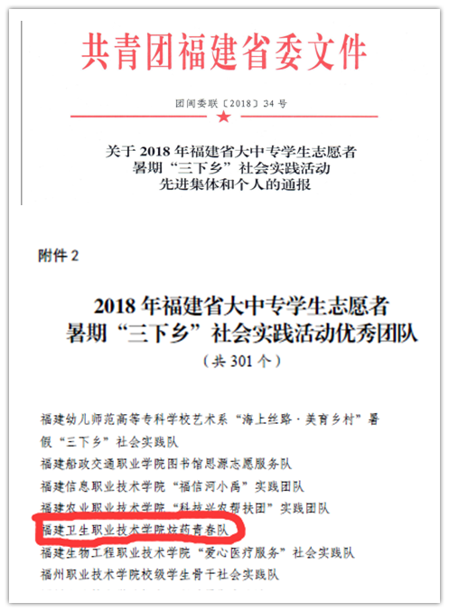 ,近期團省委對在 2018 年福建省大中專學生志愿者暑期文化科技衛生“三下鄉”社會實踐活動中表現突出的單位及個人進行表彰,藥學系炫藥青春實踐隊光榮上榜,榮獲福建省大中專學生志愿者暑期三下鄉社會實踐活動優秀團隊榮譽稱號。