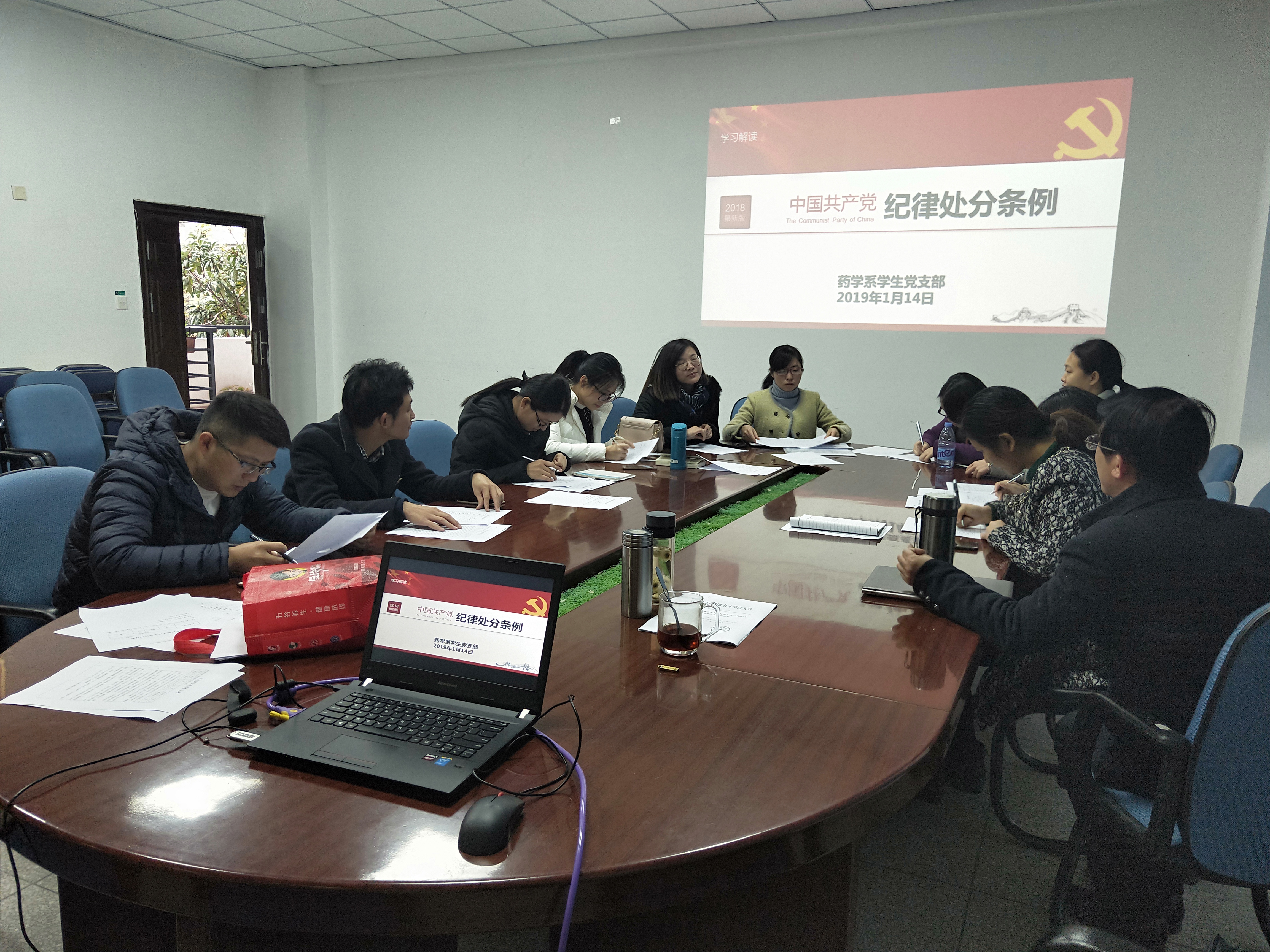 1月15日,藥學系學生黨支部黨員在藥學系207會議室學習《中國共產黨紀律處分條例》,并進行了討論。