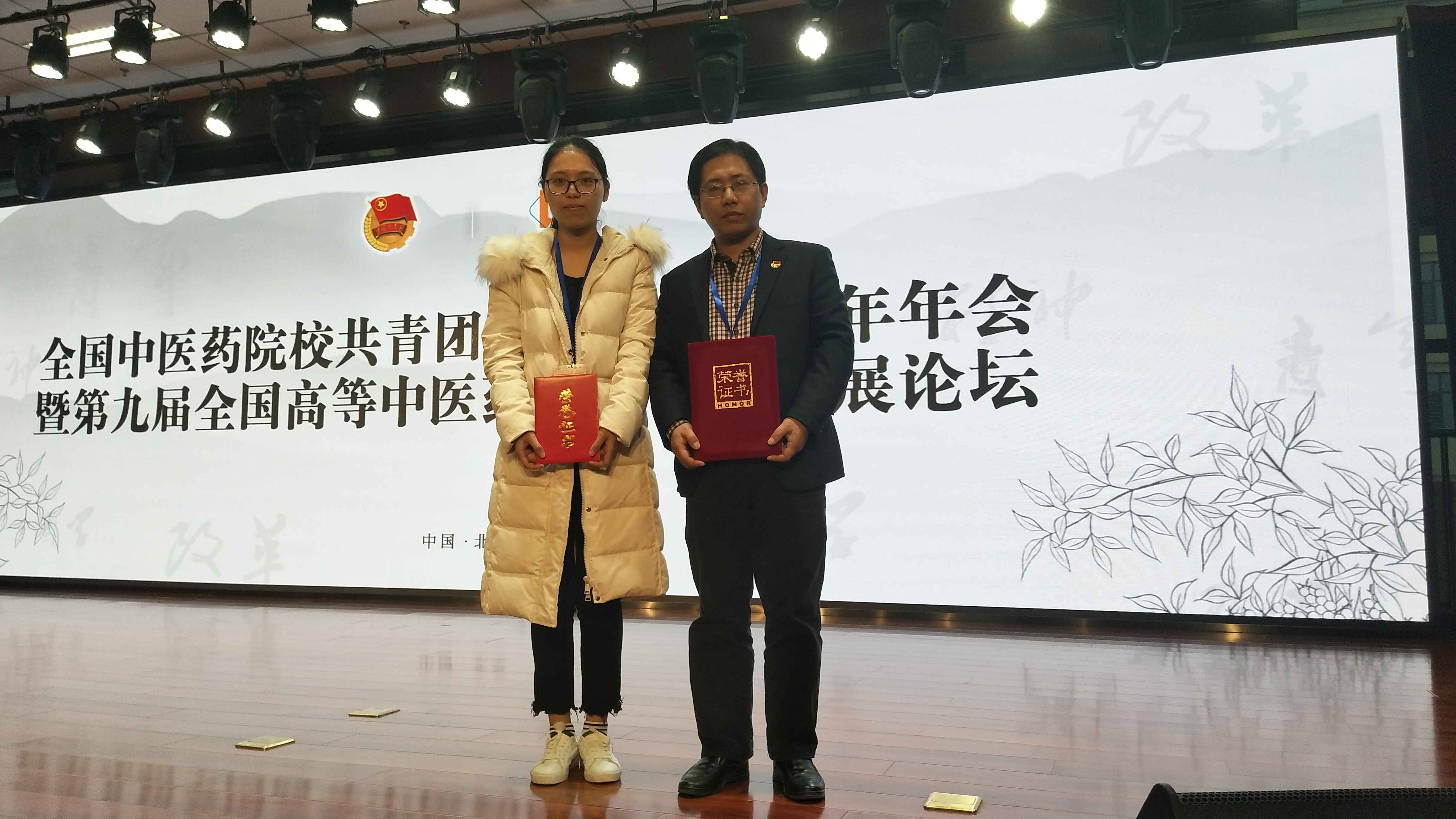 2018年11月26日,全國中醫藥院校共青團工作聯盟2018年年會暨第九屆全國高等中醫藥院校青年發展論壇在北京中醫藥大學開幕。我系李泳寧同志作為代表參加本次會議,該同志經過全國高等中醫藥院校青年研究會專家評審,最終榮獲第九屆全國高等中醫院校優秀青年榮譽稱號,也是本次全國唯一獲獎高職院校青年教師。