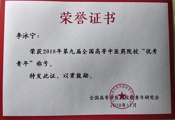 喜報-我系李泳寧同志榮獲第九屆全國高等中醫院校優秀青年榮譽稱號