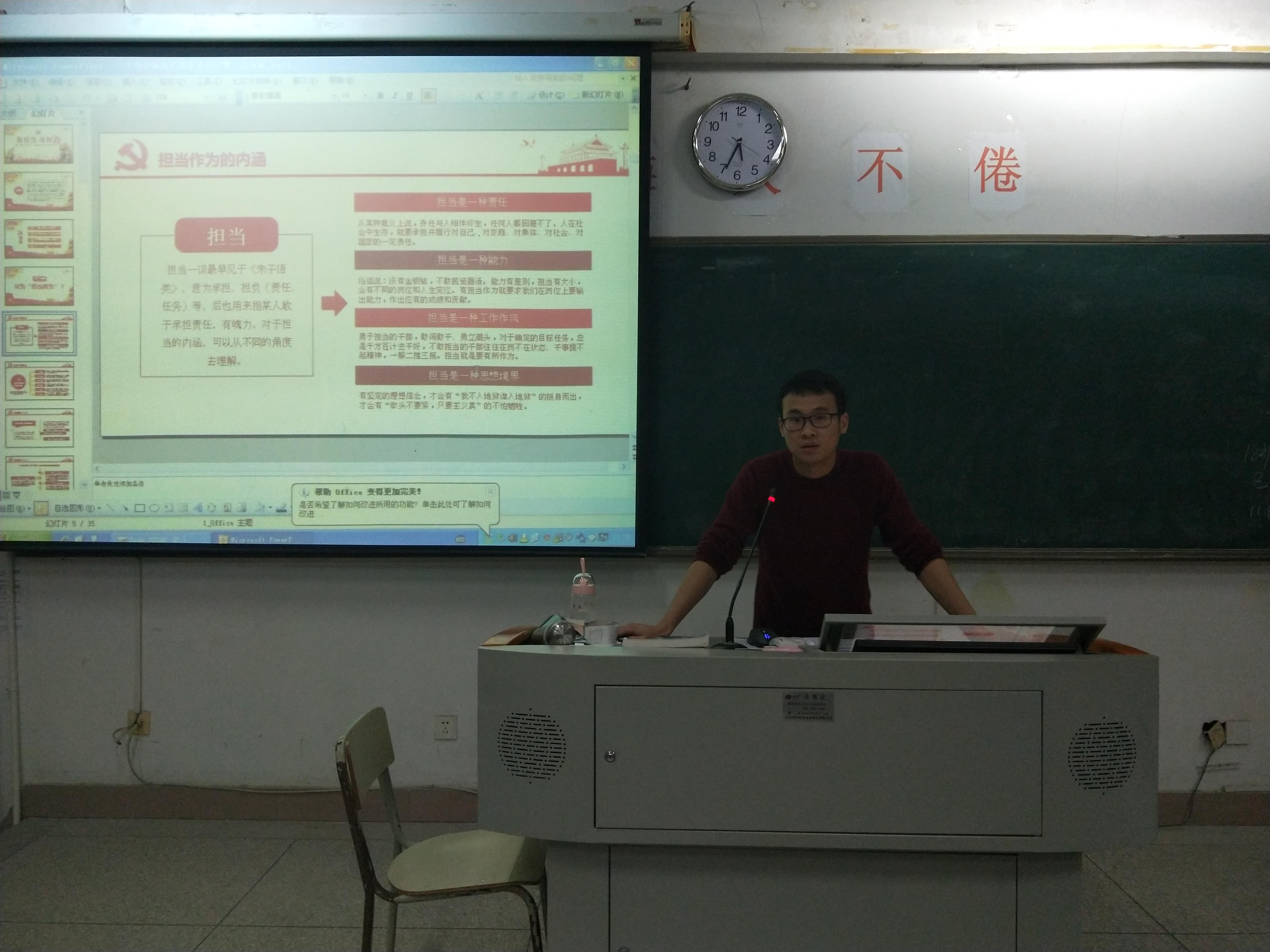 鄭老師從何為“擔(dān)當(dāng)作為”、新時(shí)代黨員干部如何擔(dān)當(dāng)作為等方面展開。他提到在黨的97年的光輝歷程中,一代代中國(guó)共產(chǎn)黨人與時(shí)俱進(jìn)地賦予擔(dān)當(dāng)精神以豐富內(nèi)涵,要?jiǎng)?chuàng)新思維、勤于思考、善于總結(jié)。接著鄭老師結(jié)合習(xí)近平總書記的話與學(xué)員共勉:“是否具有擔(dān)當(dāng)精神,是否能夠忠誠(chéng)履責(zé)、盡心盡責(zé)、勇于擔(dān)責(zé),是檢驗(yàn)每一個(gè)領(lǐng)導(dǎo)干部身上是否真正體現(xiàn)了共產(chǎn)黨人先進(jìn)性和純潔性的重要方面”。希望新時(shí)代青年要有擔(dān)當(dāng)精神,勇于擔(dān)當(dāng)、敢于擔(dān)當(dāng)、善于擔(dān)當(dāng)。