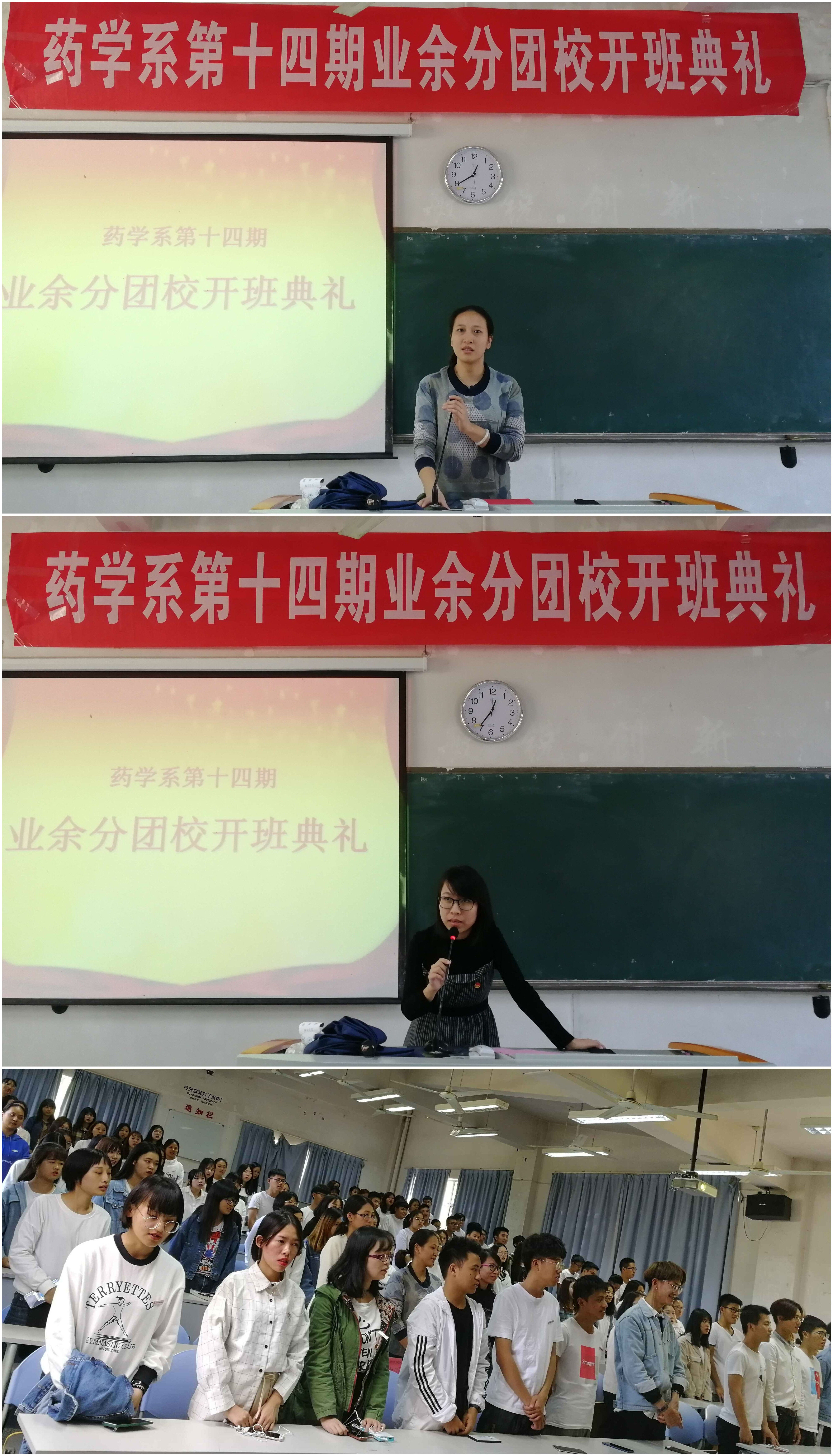 2018年10月29日,藥學系于藥一階隆重舉行業余分團校開班典禮。藥學系黨總支副書記陳潔、團總支書記黃嵩梅、團總支副書記尹德愛及100名團校學員參加儀式。