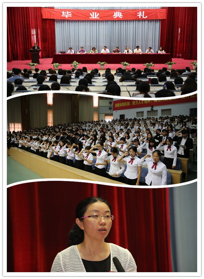 畢業典禮在莊嚴的國歌中拉開帷幕。教務處姜華萍副處長宣讀了畢業生名單,學工處宋維副書記宣讀了優秀畢業生名單和優秀實習生名單。與會領導為畢業生代表、優秀畢業生及優秀實習生頒發證書。接著由李寶珠老師領誓,全體畢業生莊嚴宣讀了醫學生誓詞。隨后,畢業生代表曾佳佳、邱玥星發言,他們總結了三年來所學知識和技能,深切表達對學院領導、老師的感激之情和對同學、朋友的不舍之情,以及即將踏上社會的堅定信心。王燕老師代表全體教師表達了對畢業生們的關心和殷切希望。