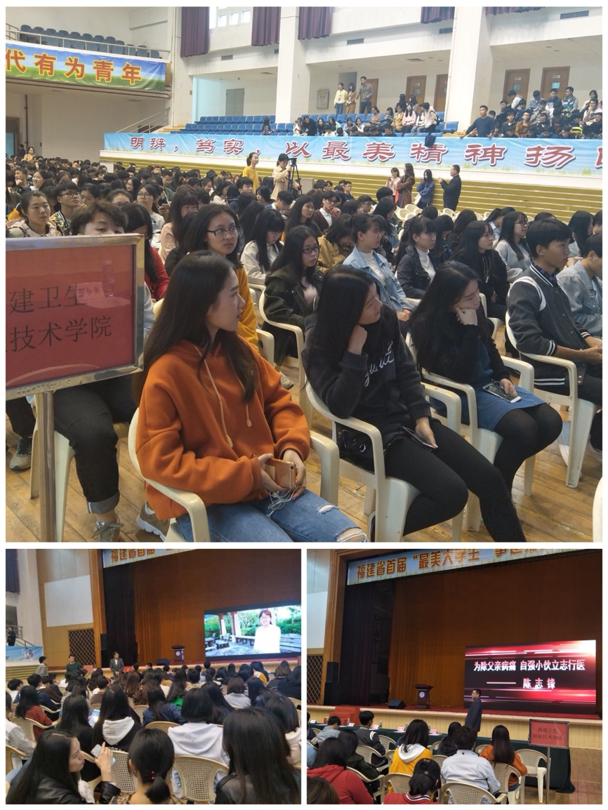 在本次報告會中,來自福建農林大學的童璽分享大學生涯的創業、學業、人生的追夢歷程;福建醫科大的陳志峰分享用笑臉迎接悲慘的人生,播撒善意,傳遞溫暖;福建工程學院的施玲珊則分享敞開心扉接納他人服務他人的志愿之美,塑造宣傳踐行歷程的專業之美;寧德師范學院的葉思思給在場的師生講述了她永無止境的學習,要贏就要贏到最后的比賽實踐經驗。四位“最美學生”的精彩報告,事例生動、故事感人、令人振奮。他們的報告贏得了現場師生的陣陣掌聲。這場報告會給師生們帶來了極大的影響,使他們的精神受到了洗禮,思想得到了升華,靈魂得到了凈化。