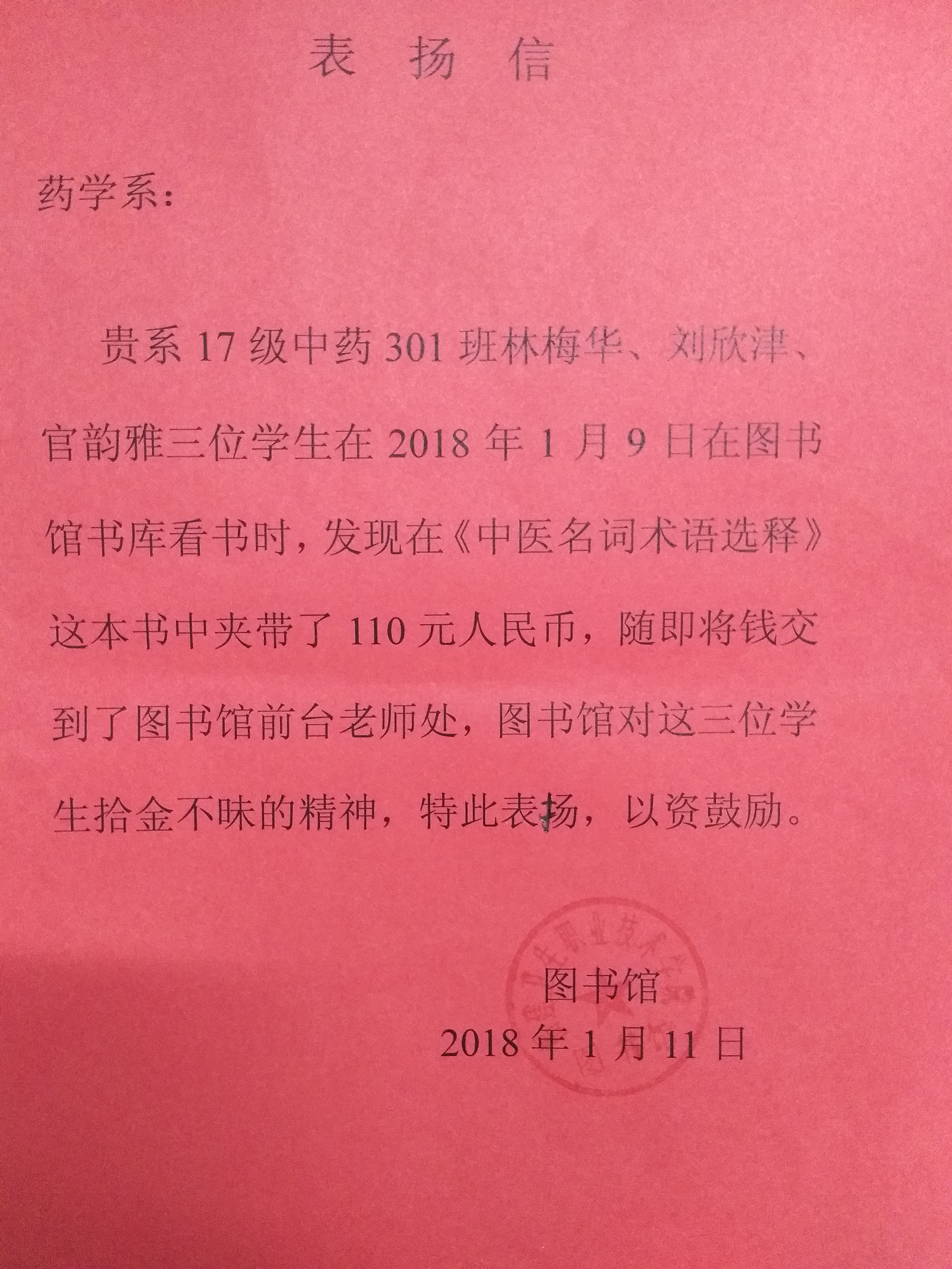 2018年1月11日,藥學系收到圖書館對我系17級中藥301班林梅華、劉欣津、官韻雅三位學生的表揚信。這三位學生在