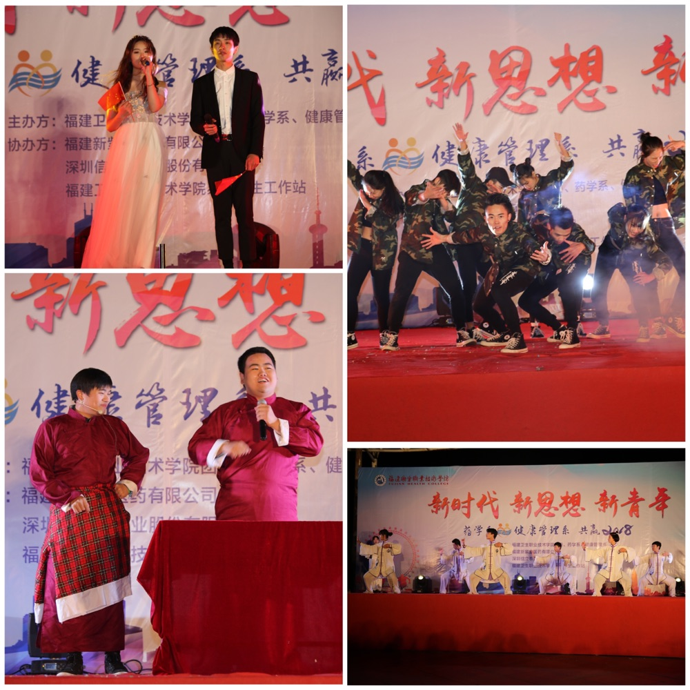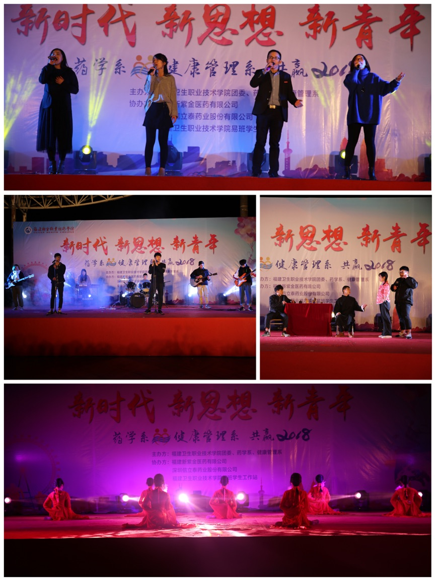 為積極響應黨的十九大精神的號召,展現師生豐富的校園文化生活,值此元旦佳節,福建衛生職業技術學院團委、藥學系、健康管理系于2017年12月25日在音樂廣場攜手舉辦以“新時代、新思想、新青年”為主題的元旦晚會。出席本次晚會的嘉賓有學院黨委林建團副書記、福建新紫金醫藥有限公司鄭朝陽經理、深圳信立泰藥業股份有限公司林毅總經理丶王鶴副總經理、黨工部吳華部長、院辦吳燕玲副主任、紀檢監察室程劍芬主任、教務處王珊珊副處長、院團委黃曦書記、學工處負責人宋維處長、現代教育技術中心林穎峰主任、護理系黨總支謝濤書記、馬克思主義學院熊美蘭院長、公基部葉菁主任、醫學技術系邱滾忠副書記,以及各兄弟系部團總支書記及老師。黨委林建團副書記代表學院上臺致辭。