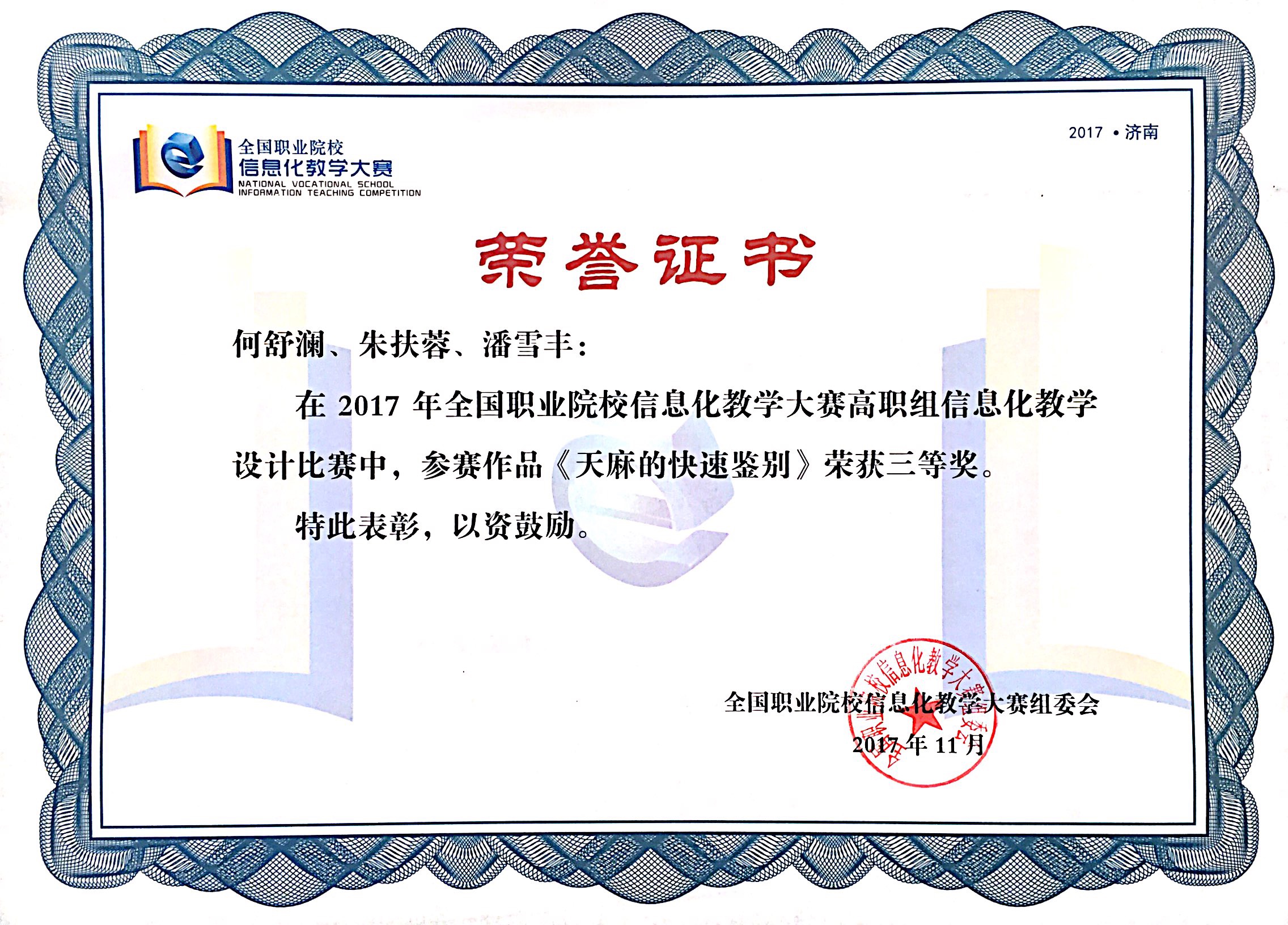 我系何舒瀾、朱扶蓉、潘雪豐等三位教師的參賽作品《天麻的快速鑒別》作品經(jīng)過院賽、省賽、省選拔賽、國賽網(wǎng)絡(luò)評(píng)審等層層選拔,最終進(jìn)入決賽,并憑借先進(jìn)的教學(xué)理念、精巧的教學(xué)設(shè)計(jì),精湛的授課能力獲得高職組信息化教學(xué)設(shè)計(jì)大賽三等獎(jiǎng)。