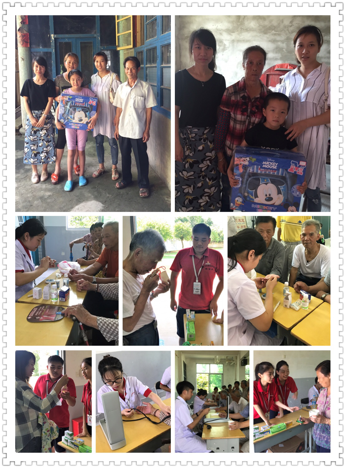 活動現場,志愿者們合理分工,分別組成血壓組、血糖組、藥品發放組、涼茶組及貧困慰問組。大家各司其職,有條不紊地開展服務工作。前來參加義診的村民絡繹不絕,以中老年人居多,志愿者們根據測量的結果,有針對性地給予科學的建議;我們還為村民們分發常見的醫用藥品,如:板藍根顆粒、藿香正氣水、風油精等,并贈送我系創業部自制的中藥香囊;與此同時,在當地村委帶領下,慰問組成員前往貧困兒童家庭開展愛心捐贈活動,察看了貧困生家庭的生活學習基本情況,并送上學習用品、日常備用藥品等慰問品。