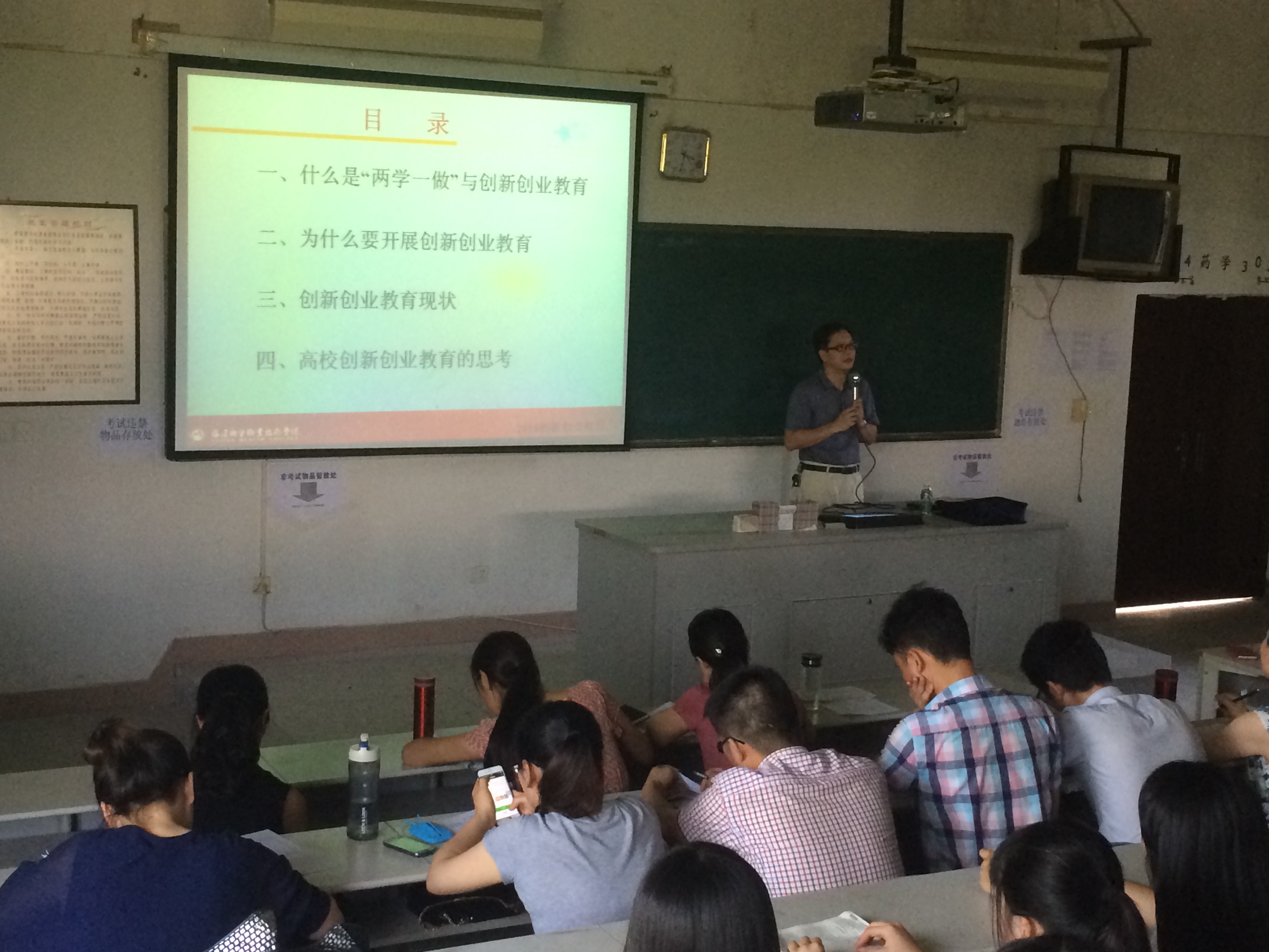 廖副院長圍繞什么是“兩學(xué)一做”與創(chuàng)業(yè)創(chuàng)新教育、為什么要開展創(chuàng)業(yè)創(chuàng)新教育、創(chuàng)新創(chuàng)業(yè)教育現(xiàn)狀、高校創(chuàng)業(yè)創(chuàng)新教育現(xiàn)狀等四個(gè)方面對(duì)高校創(chuàng)新創(chuàng)業(yè)工作作了詳細(xì)的講解。他指出搞創(chuàng)新創(chuàng)業(yè)教育首先要注重培養(yǎng)學(xué)生知識(shí)獲取的能力、分析解決問題的能力。其次要轉(zhuǎn)變教育理念,創(chuàng)新創(chuàng)業(yè)工作是面向全體學(xué)生的、是全體教師參與的、是融入到人才培養(yǎng)全過程的;要建立創(chuàng)新創(chuàng)業(yè)教育課程體系;要改革教學(xué)方法;要加快推進(jìn)學(xué)分制教學(xué)改革;要鼓勵(lì)大學(xué)生參加各類創(chuàng)新創(chuàng)業(yè)比賽和職業(yè)技能比賽。