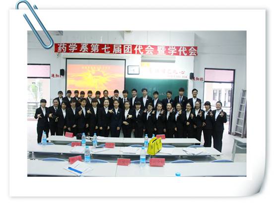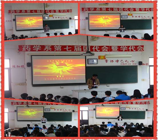 2016年4月12日下午2:00,藥學系第七屆團代會暨學代會換屆改選于教學樓311隆重舉行。院團委宋維書記、藥學系黨總支蘇愛華書記、藥學系團總支書記李寶珠老師、團總支副書記黃嵩梅老師、各輔導員老師、兄弟系團總支嘉賓以及170多名團、學代表出席了本次大會。
