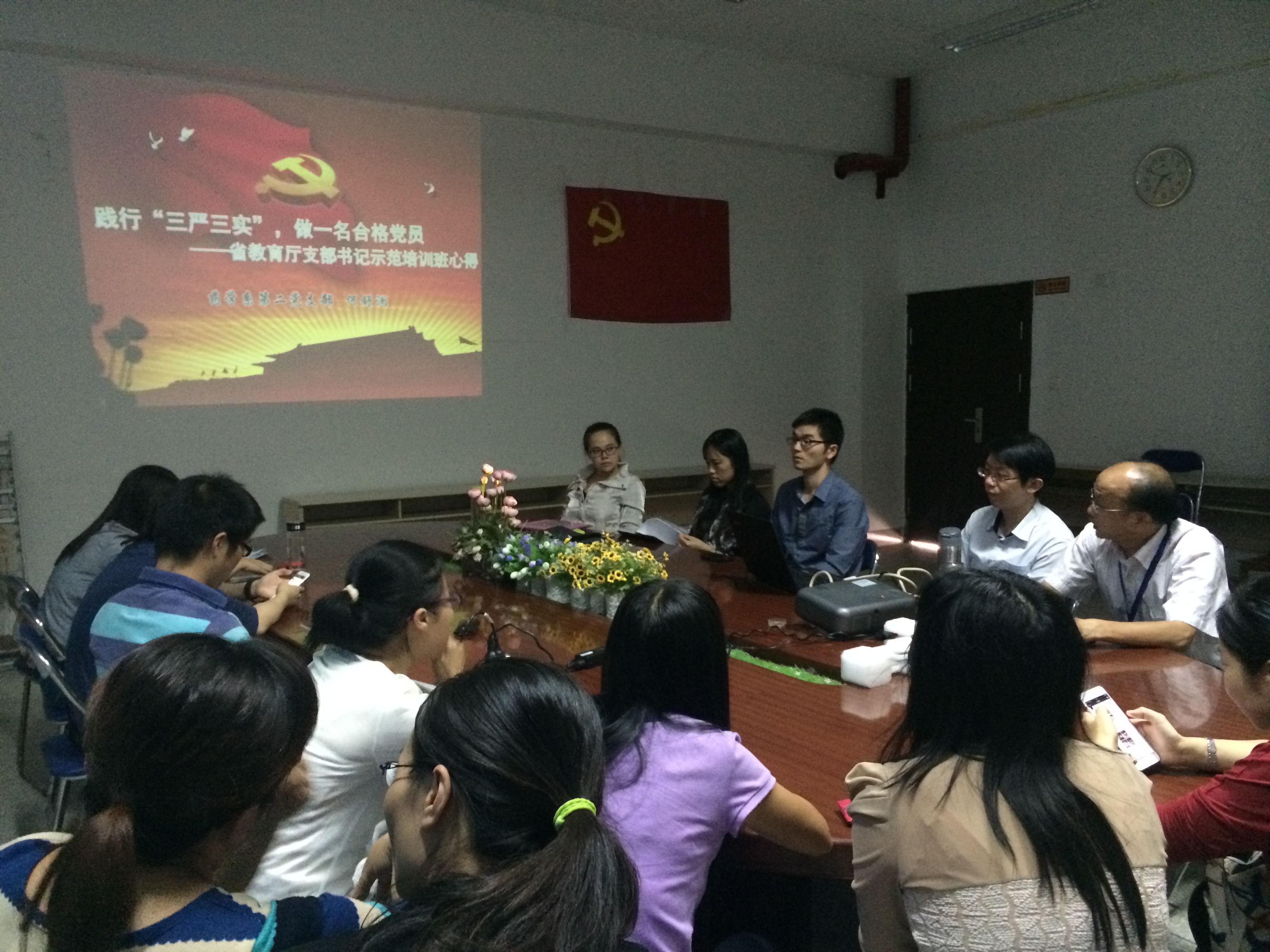 何舒瀾同志結合九月份參加省教育廳支部書記示范培訓班的學習體會,以《踐行“三嚴三實”,做一名合格的共產黨員》為題,圍繞著“‘三嚴三實’的基本內涵、當前工作中存在的‘不嚴不實’問題;以及如何做一名合格的共產黨員”等三個方面進行了講解和分析。全體黨員都認真聽講并做好筆記。