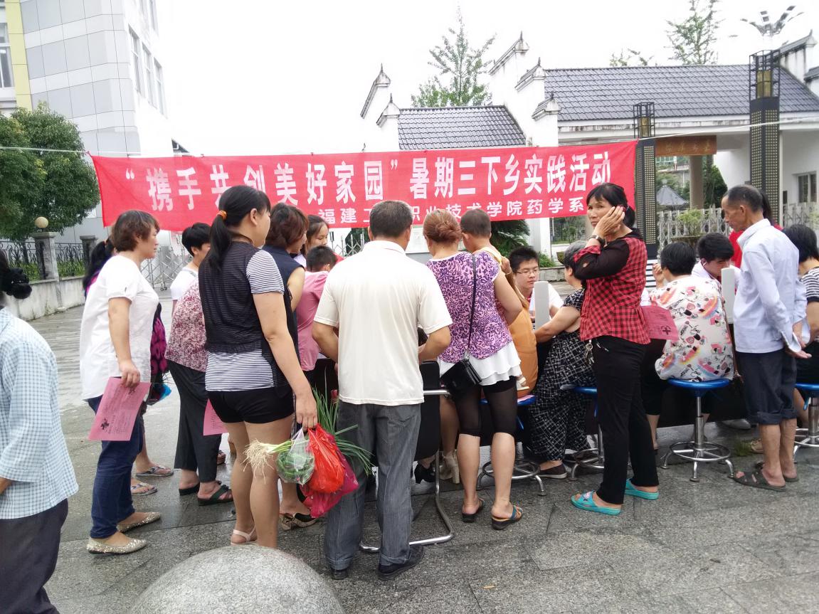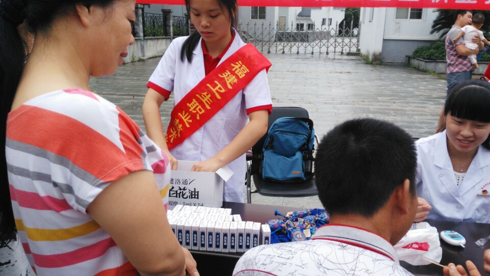 7月3日清晨,在當地團委工作人員的帶領下, 福建衛生職業技術學院藥學系“炫藥青春”服務隊的志愿者們針對當地農民的義診活動在黃坑鎮鎮中心嘉禾廣場拉開了序幕。本次義診主要是為建陽市黃坑鎮的鄉民進行血壓測量、血糖常規檢查、發放中藥香囊、惠農小報、常見疾病預防小報,以及由黃氏藥業贊助的白花油等。