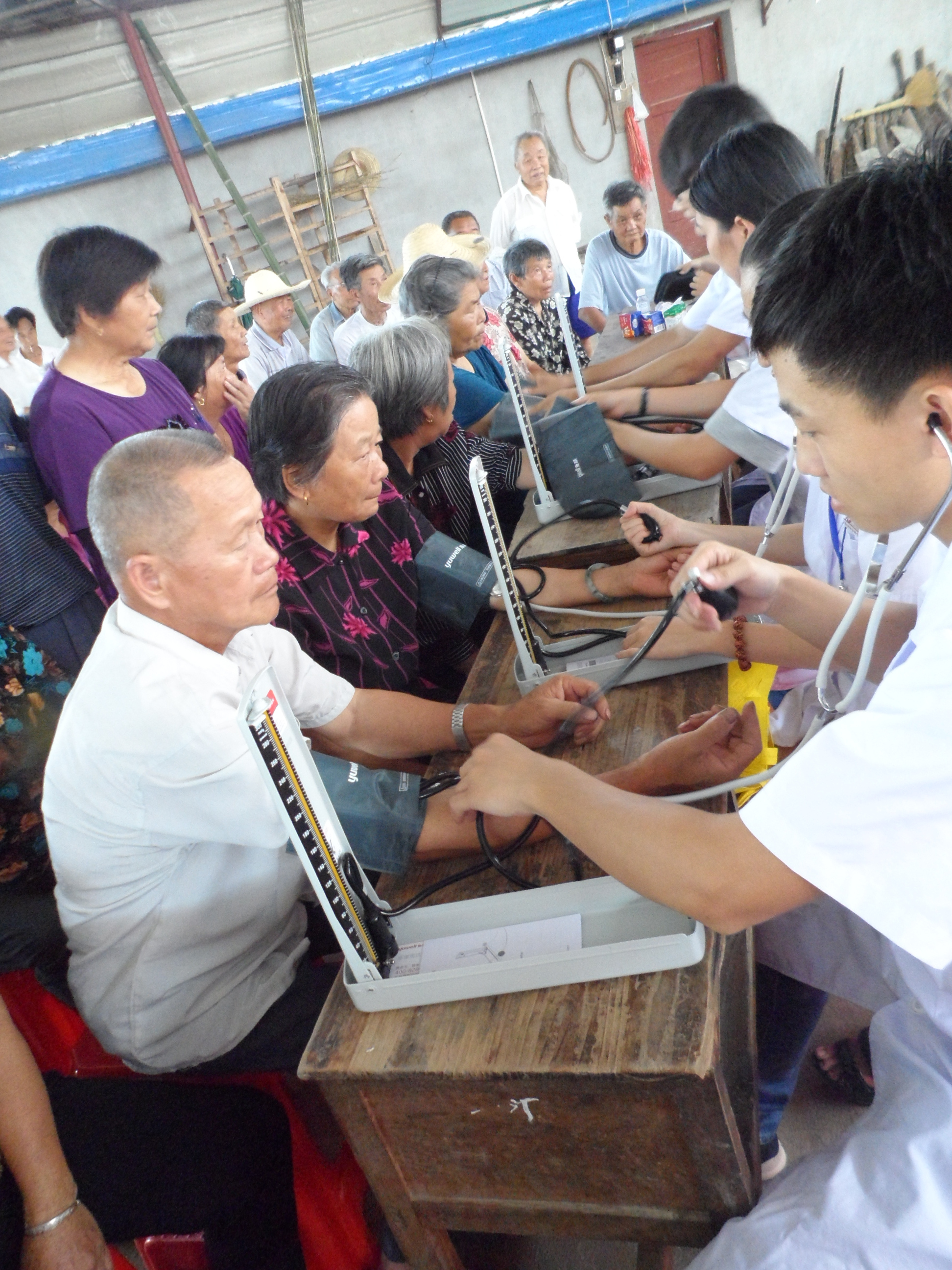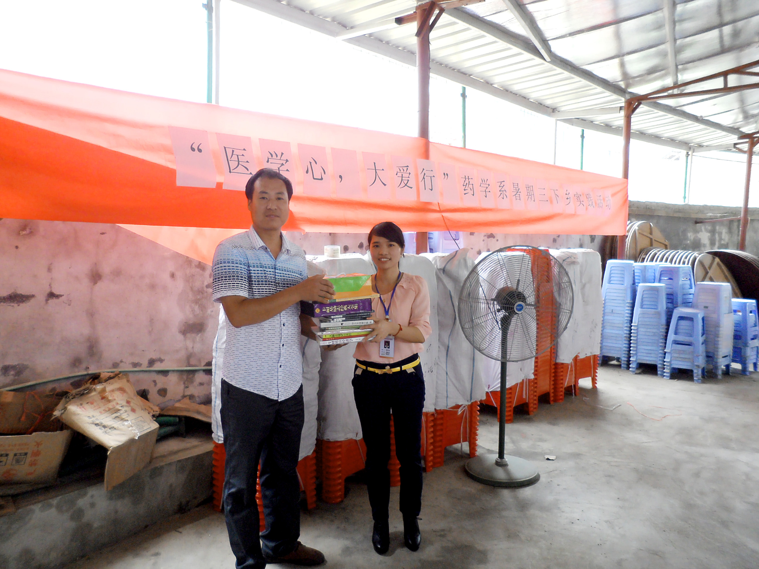 7月4日上午到達目的地后,映入眼簾的是早已坐著等候的村民們。在當地村干部的幫助與支持下,志愿者們各司其職迅速開展各項活動,志愿者們身著白帶褂,熱情專業地為村民們開展了健康宣傳及體檢活動,為村民進行血壓測量、測血糖、健康咨詢活動;舉辦了“用藥知識講座”,發放了500多份健康知識手冊,宣傳日常用藥安全知識;發放藿香正氣水、Vc銀翹片、雙黃連、頭孢拉定等常用藥品,價值1000多元。活動現場氣氛異常熱烈,村干部們熱情地幫忙維持現場秩序;而村衛生所的黃醫生的到來幫忙,不僅為志愿者們鼓舞了士氣,更讓大家看到了村委們的團結熱情。隨后,系團總支書記林麗鳳老師代表系部向當地村小學捐贈圖書30多冊。
