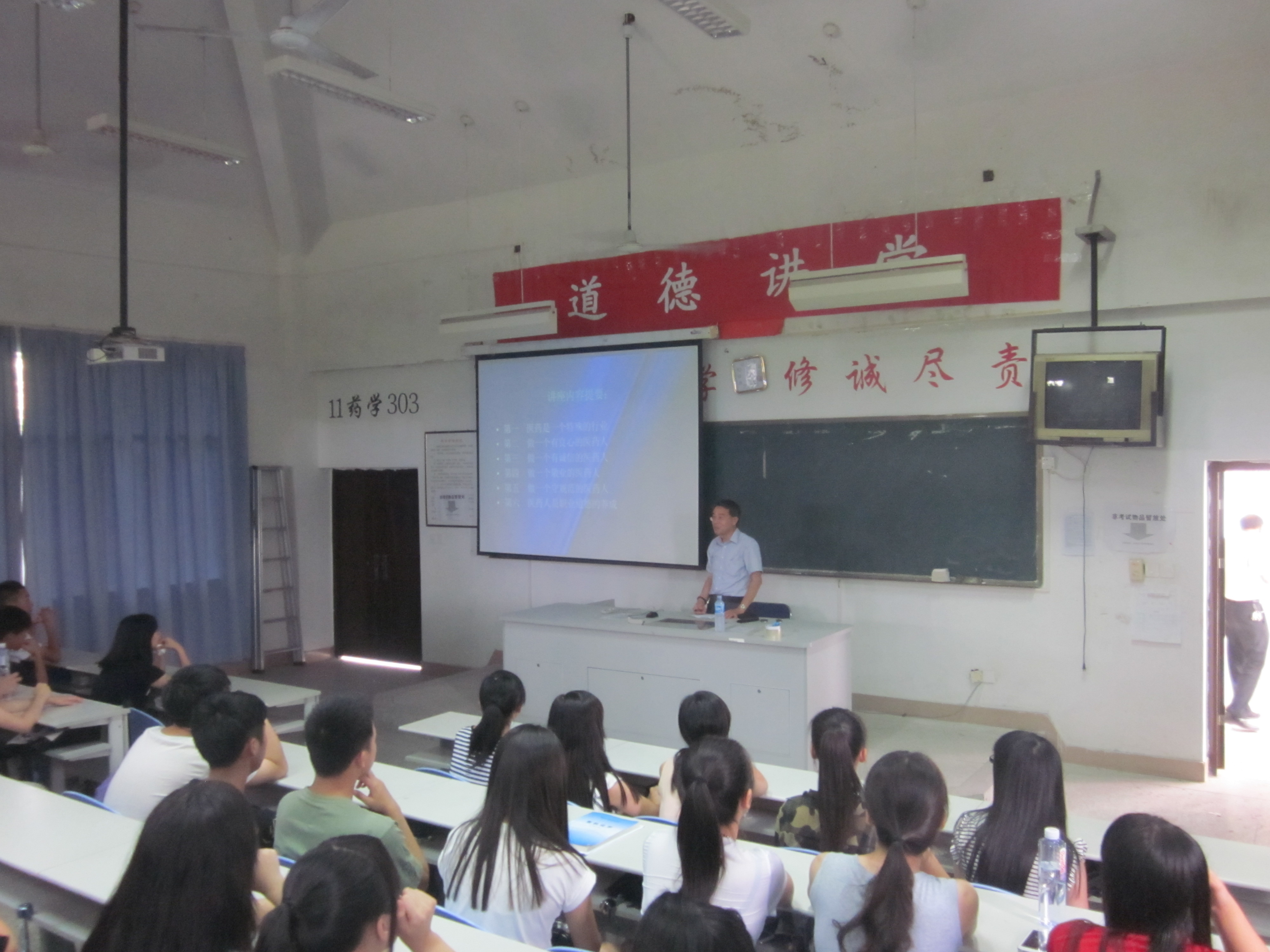 隨后由原藥學(xué)系黨總支書記歐春木副教授給同學(xué)帶來了《珍愛生命 創(chuàng)造健康--醫(yī)藥人員職業(yè)道德教育》的精彩講座。首先,介紹了醫(yī)藥行業(yè)是一個特殊行業(yè),醫(yī)藥產(chǎn)品關(guān)系著人類的生命健康,與人類生存息息相關(guān)。其次,通過大量的案例分析介紹,如何做一個有良心、有誠信、守規(guī)范和敬業(yè)的醫(yī)藥人員。最后,從調(diào)整健康的心態(tài)、養(yǎng)成良好的習(xí)慣、進(jìn)行有效的溝通和確定明確的目標(biāo)等四方面教導(dǎo)學(xué)生培養(yǎng)良好的職業(yè)道德。