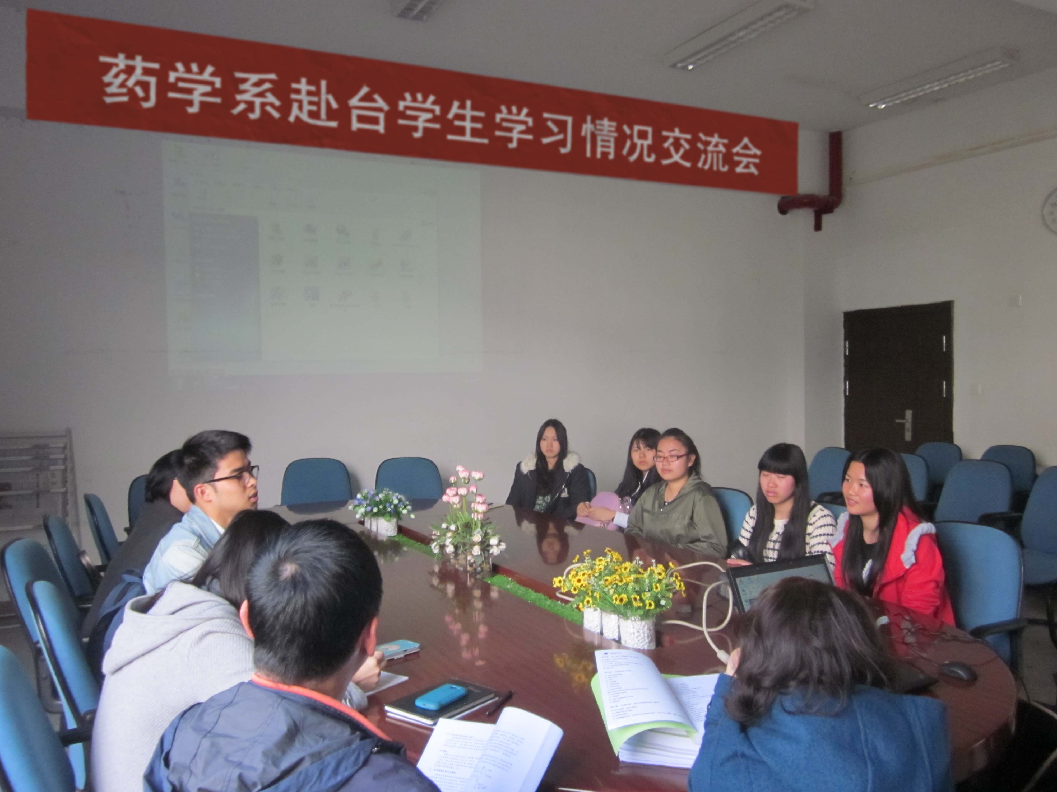 2014年2月26日下午,在藥學系會議室召開了赴臺學生學習情況交流會。2012級藥學專業的6位同學、藥學系肖健副主任、本次赴臺的指導老師邱騰穎老師以及馮珊老師、林穎峰老師、教學秘書康婷婷老師以及輔導員林麗鳳老師參加了交流會。