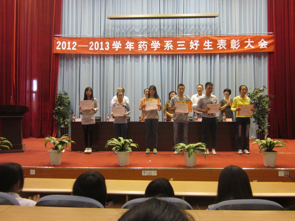 藥學(xué)系于10月29日下午在學(xué)術(shù)廳隆重召開“藥學(xué)系2012-2013學(xué)年三好生表彰大會暨暑期社會實踐先進(jìn)個人表彰大會”。 大會由系辦公室主任林穎峰老師主持,魏立娜副院長、學(xué)工處黃銘珊處長、系黨總支蘇愛華副書記、肖建副主任、林小蘭副主任及藥學(xué)系全體輔導(dǎo)員出席了本次大會。
