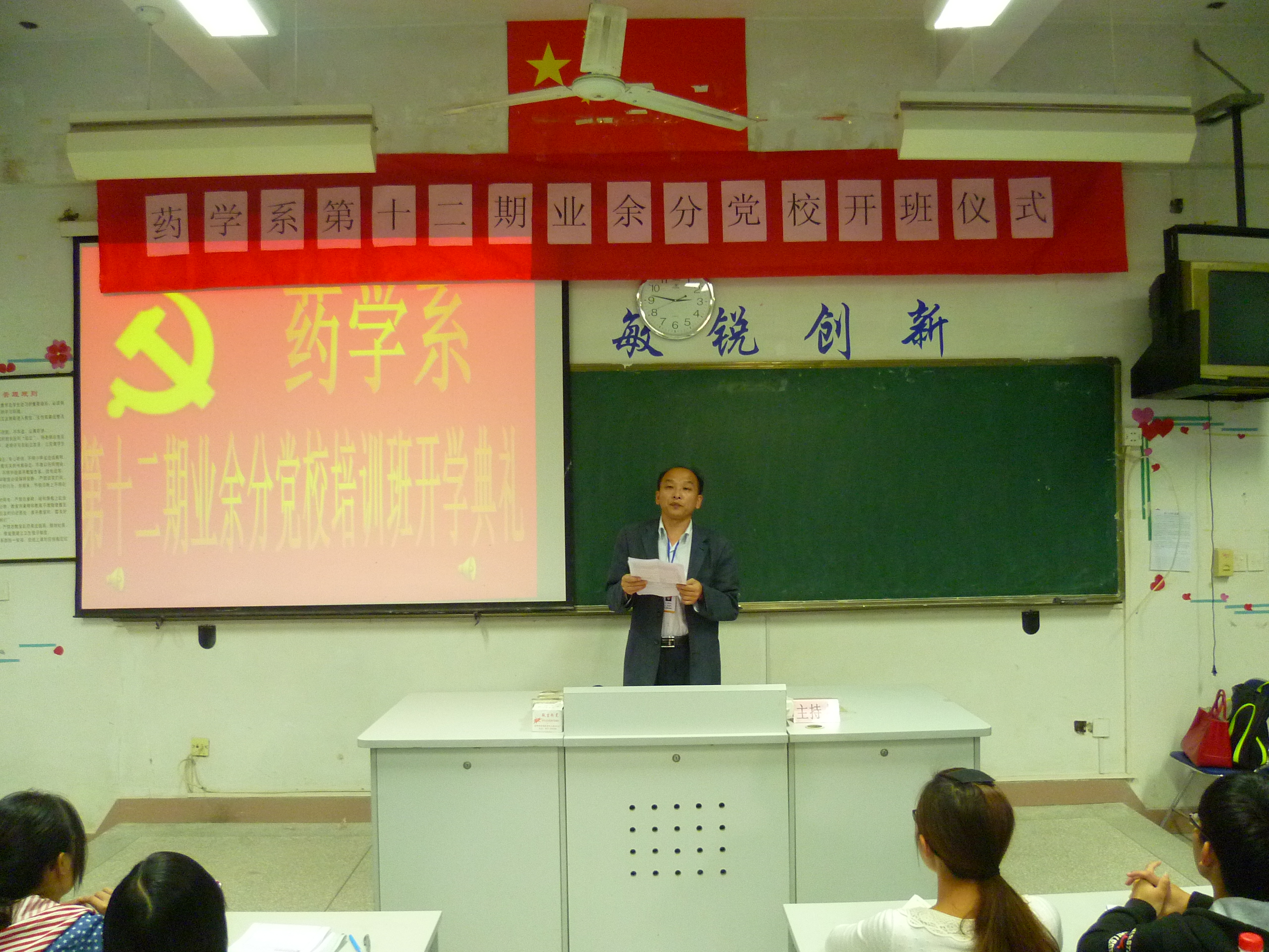 藥學系于4月16日在藥學系第一階梯教室舉行第十二期業(yè)余分黨校培訓班開班典禮。藥學系黨總支蘇愛華副書記、系團總支書記王鈍銳老師出席了本次開班典禮。