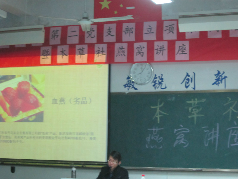 2013年3月7日晚上7:30,為豐富藥學系學生會本草社社團活動內容,提升本草社社員們的專業素養,藥學系第二黨支部、藥學系學生會本草社在藥學系第一階梯教室聯合舉辦首場專業講座——《燕窩的采收與鑒定》。本次講座的主講人是藥學系第二黨支部書記、中藥教研室的何舒瀾老師。通過何舒瀾老師由淺入深、圖文并茂的講演,廣大社員對燕窩的來源、形成、采收、分級、真偽優劣鑒定及食用方法等方面都有了新的認識,拓展了視野,豐富了專業知識,也提高了社員們的養生保健意識。講座后本草社長李明俊和系社團部長林雨頭同學針對講座開展的形式和內容征求了社員們的意見,大家普遍感覺收獲不小,激發了學習中藥知識的熱情,希望以后類似講座能多多開展。