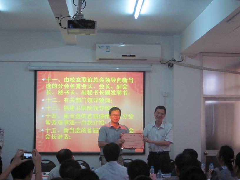 10月27日,福建衛(wèi)生職業(yè)技術(shù)學(xué)院在漳州市醫(yī)院舉辦漳州市校友聯(lián)誼會(huì)成立大會(huì)。我院副院長(zhǎng)廖偉堅(jiān)、院辦公室副主任葉海、學(xué)工處處長(zhǎng)黃銘珊、藥學(xué)系黨總支副書記蘇愛(ài)華、藥學(xué)系副主任陳穗等專程前往,出席了校友聯(lián)誼會(huì)成立大會(huì)。來(lái)自漳州市衛(wèi)生局、漳州市醫(yī)院、漳州市婦幼保健院、漳州市衛(wèi)生監(jiān)督所、漳州市中醫(yī)院等各個(gè)部門的50余名漳州校友參加了此次大會(huì)。大會(huì)由龍海市第一醫(yī)院信息科長(zhǎng)、副主任藥師林亞田主持。