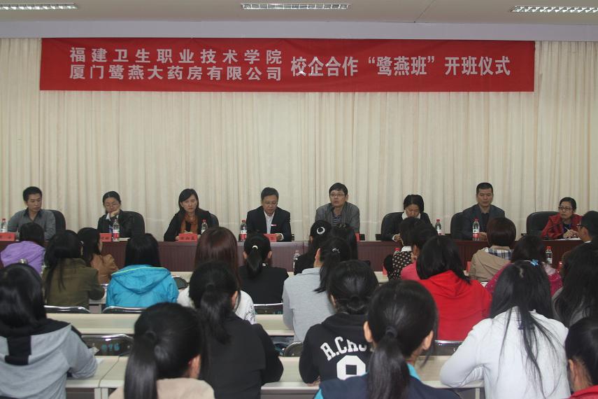 11月15日,我院與廈門鷺燕集團的校企合作鷺燕班開班儀式在我院行政樓舉行。出席儀式的有副院長廖偉堅、廈門鷺燕集團副總裁朱明國先生、廈門鷺燕大藥房有限公司總經(jīng)理陳湘荔女士和鷺燕集團的相關領導以及我院學生處、教務處等相關部門負責人。會議由福建衛(wèi)生職業(yè)技術(shù)學院藥學系倪峰主任主持。參加儀式的還有廈門鷺燕班的40名學生。