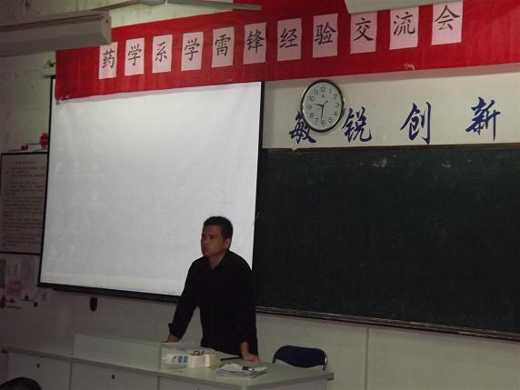 2012年4月26日藥學系團總支在藥學系第一階段教室舉行藥學系學雷鋒經驗交流會,全系20個班級團支部書記以PPT的形式進行學雷鋒活動匯報,向同學們介紹三月份以來所開展的一系列豐富多彩的學雷鋒活動,藥學系團總支書記王鈍銳老師,藥學系團總支副書記陳炳秀老師以及系團總支委員出席了此次大會。