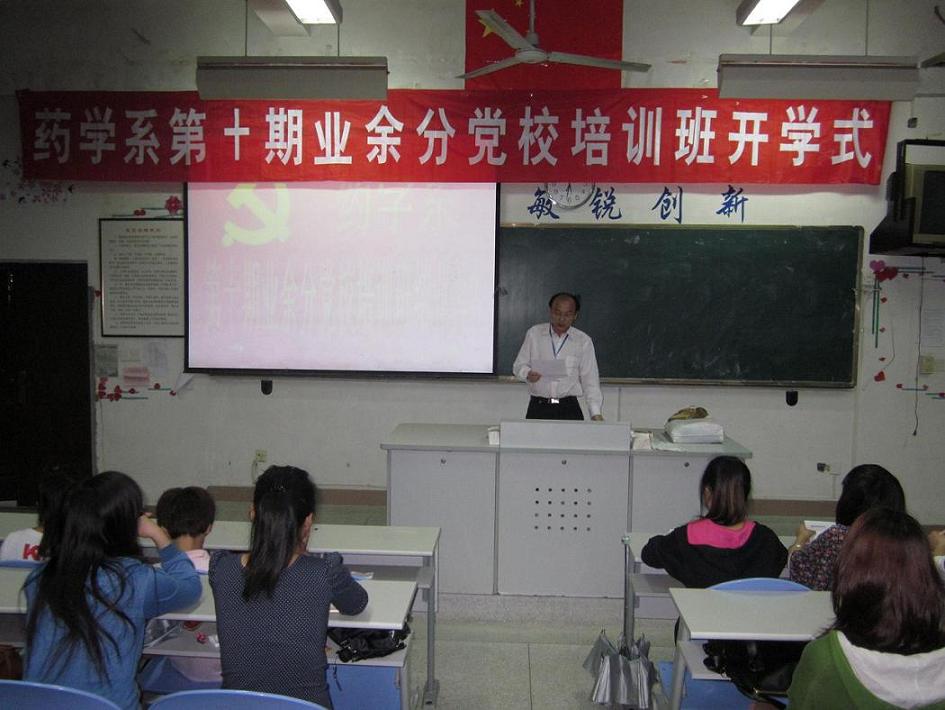 藥學系于2012年5月3日下午在藥學系第一階梯教室舉行第十期業余分黨校培訓班開班典禮。藥學系黨總支蘇愛華副書記、系團總支書記王鈍銳老師、系團總支副書記陳炳秀老師、輔導員陳瑜老師出席了本次開班典禮。