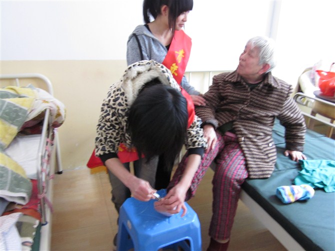 11藥學302團支部以‘敬老愛親的道德行為、培育良好的文明風尚’為主題,組織本班同學到“國醫康護院”’看望老人,同時也為老人們準備了熬粥的材料。同學們為爺爺奶奶捶背洗腳、整理床褥、打掃衛生……當同學們將自己親手煮的“拗九粥”和慰問品送到老爺爺、老奶奶的手中時,老人們綻開了最甜美的笑容。