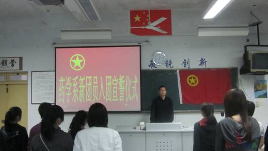 藥學系于5月3日下午在系部第一階梯教室舉行新團員入團宣誓儀式,團總支書記王鈍銳老師、團總支副書記陳炳秀老師以及團總支委員出席了宣誓儀式。 宣誓儀式在莊嚴的國歌拉開了序幕,團總支副書記陳炳秀老師宣讀了新團員的名單,接著老團員代表為新團員佩戴團徽并頒發團員證;隨后,系團總支文體委員余蓮斌同學帶領新團員宣誓。最后團總支書記王鈍銳老師講話,希望同學們要繼續發揚共青團精神,在學習和生活中做到一名真正無愧于團員這一稱號。最后高唱團歌結束了宣誓儀式。