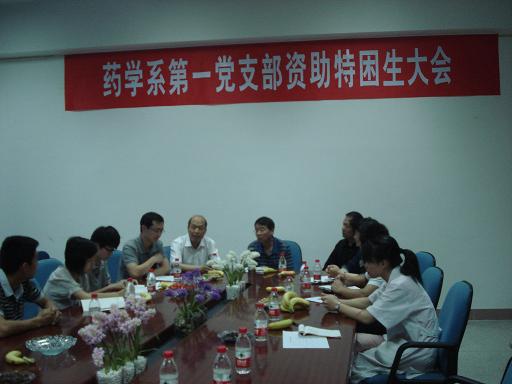 藥學系第一黨支部于2010年6月9日下午四點在藥學系會議室召開資助特困生大會。院黨委陳雄副書記、第一黨支部全體黨員及21名資助對象參加了本次大會。