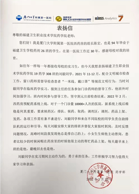 近日,藥學院收到一封來自廈門大學附屬第一醫院藥學部發來表揚信,信中滿滿都是對藥學院實習生19藥學308班劉毅同學的肯定和贊許之詞。