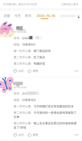 21藥學304許欣燕同學參加了本次活動,她說:“回顧每天打卡的三件‘開心事’,我發現發現快樂和找到快樂原來如此簡單!參加了本次活動,我感覺到自己對開心的事情感知能力變強了。每天入睡前,回想著今天每個開心的瞬間,嘴角會不禁再次上揚,再開心一遍!帶著愉快的心情進入甜甜的夢鄉,然后更有斗志、滿懷希望地投入到新的一天。”