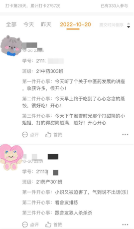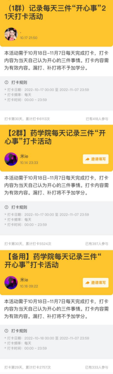 本次,藥學院以每天記錄三件“開心事”21天打卡活動為主推,組織同學們線上打卡“開心事”,引導同學們學會多發現生活中美好的人和事,以積極向上的心態面對生活,此次活動吸引力千余名學生參與,累計打卡人次超1.4萬。