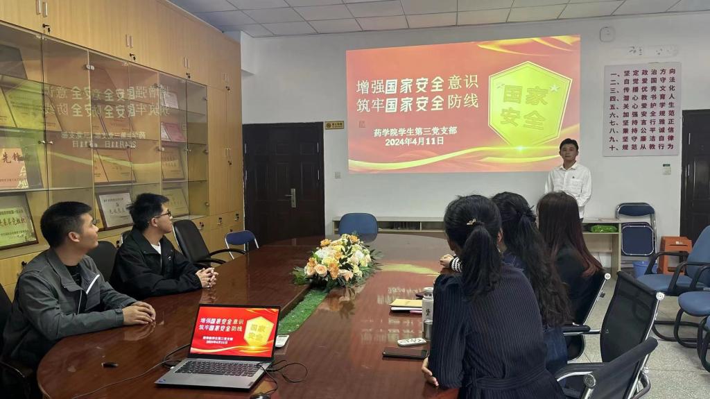 安而不忘危,存而不忘亡,治而不忘亂。2024年4月15日是第9個全民國家安全教育日,為增強全民國家安全意識,維護國家安全,4月11日,藥學院學生第三黨支部書記陳翰開展題為《增強國家安全意識,筑牢國家安全防線》主題黨課,學生第三黨支部全體教師黨員參加。