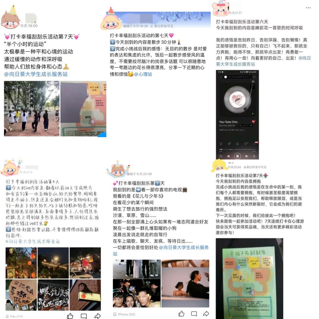 每天一張超有料的刮刮卡,就像是哆啦A夢的神奇口袋。輕輕刮開那神秘的涂層,哇塞!有可能蹦出一句超燃的勵志語,“今日的你,就是無敵小戰士,沖呀!”感覺全身都充滿了力量;也說不定會得到一份超甜的小福利——“獎勵自己去看一場超棒的電影喲”。同學們也紛紛分享“幸福刮刮樂”的奇妙體驗。活動期間,同學們發布分享數超1000條。